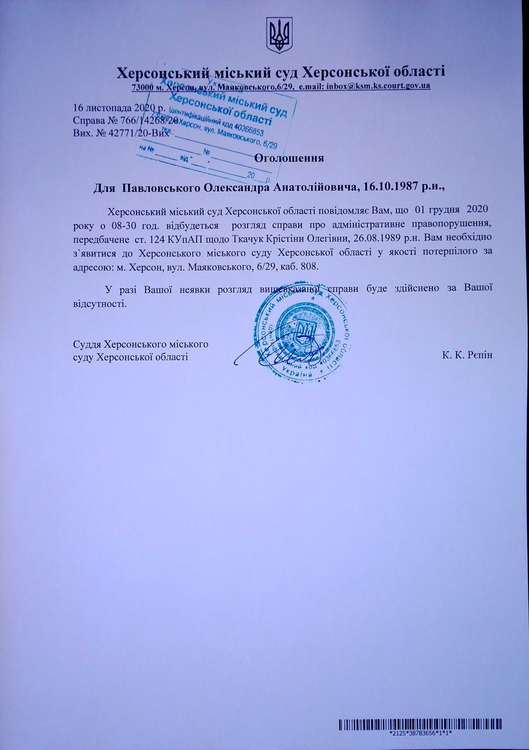 ОГОЛОШЕННЯ для Павловського Олександра Анатолійовича