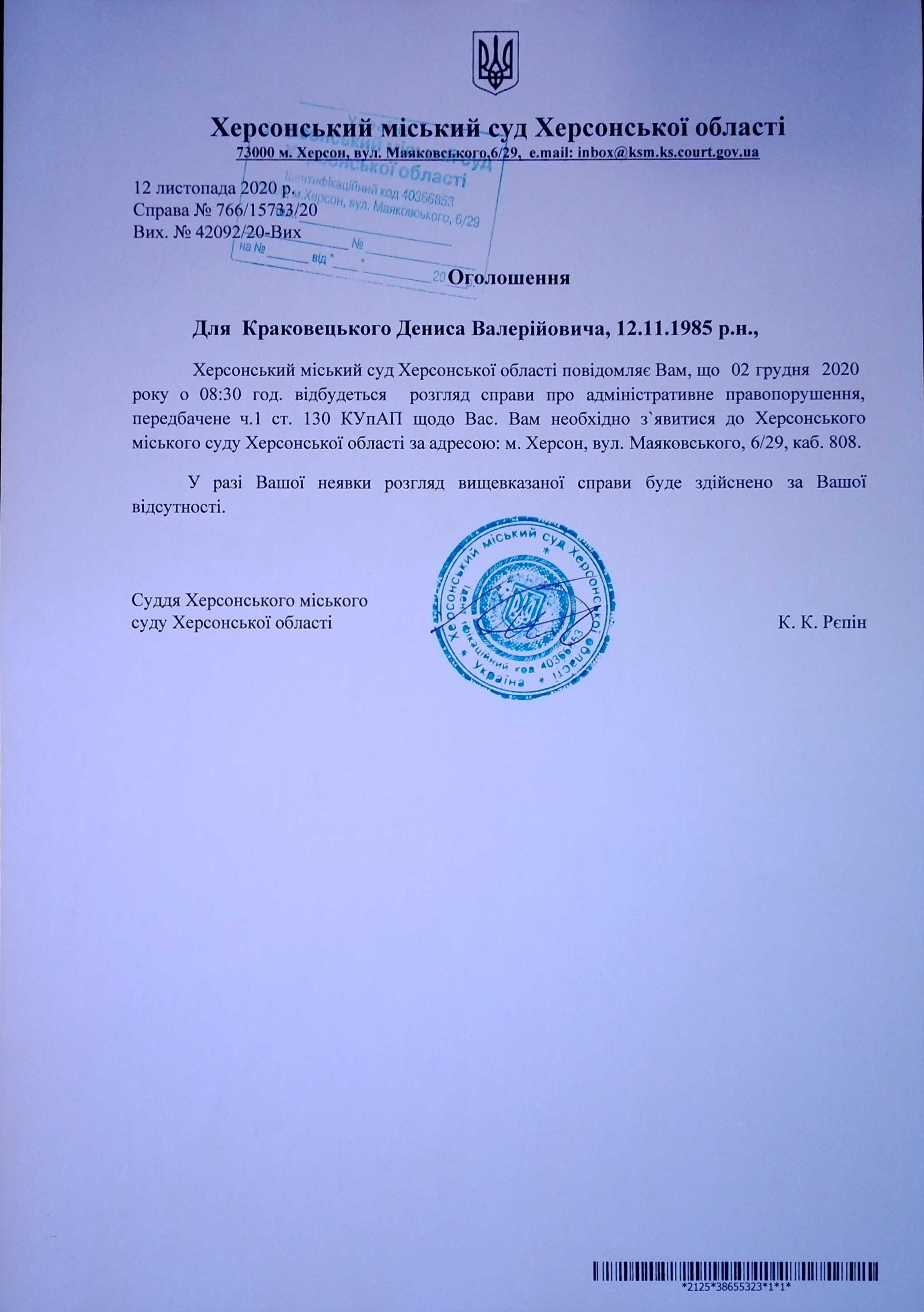 ОГОЛОШЕННЯ для Краковецького Дениса Валерійовича