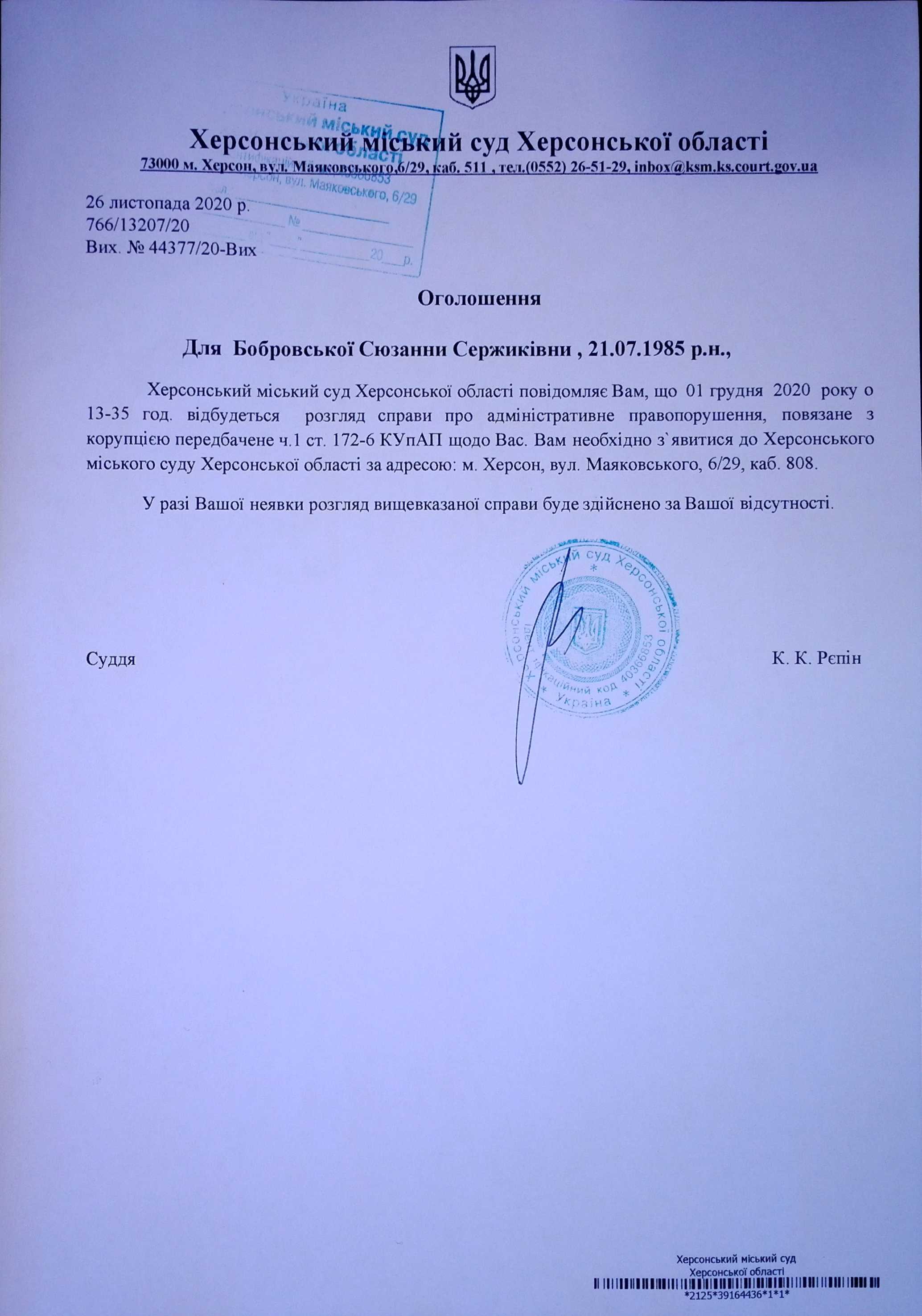 ОГОЛОШЕННЯ для Бобровської Сюзанни Сержиківни