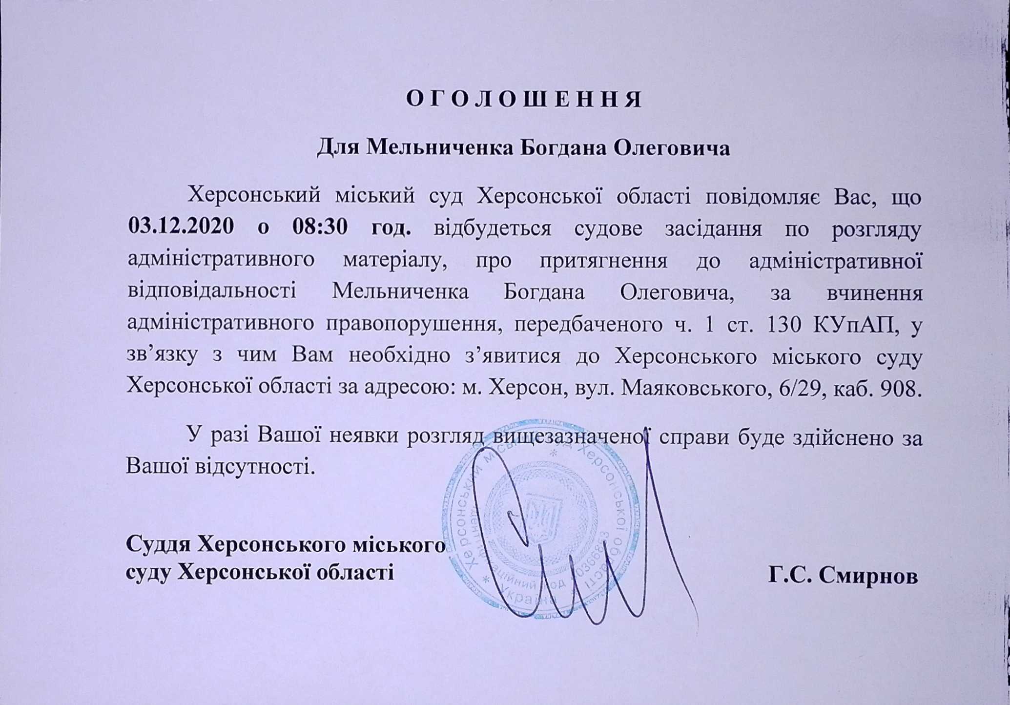 ОГОЛОШЕННЯ для Мельниченка Богдана Олеговича