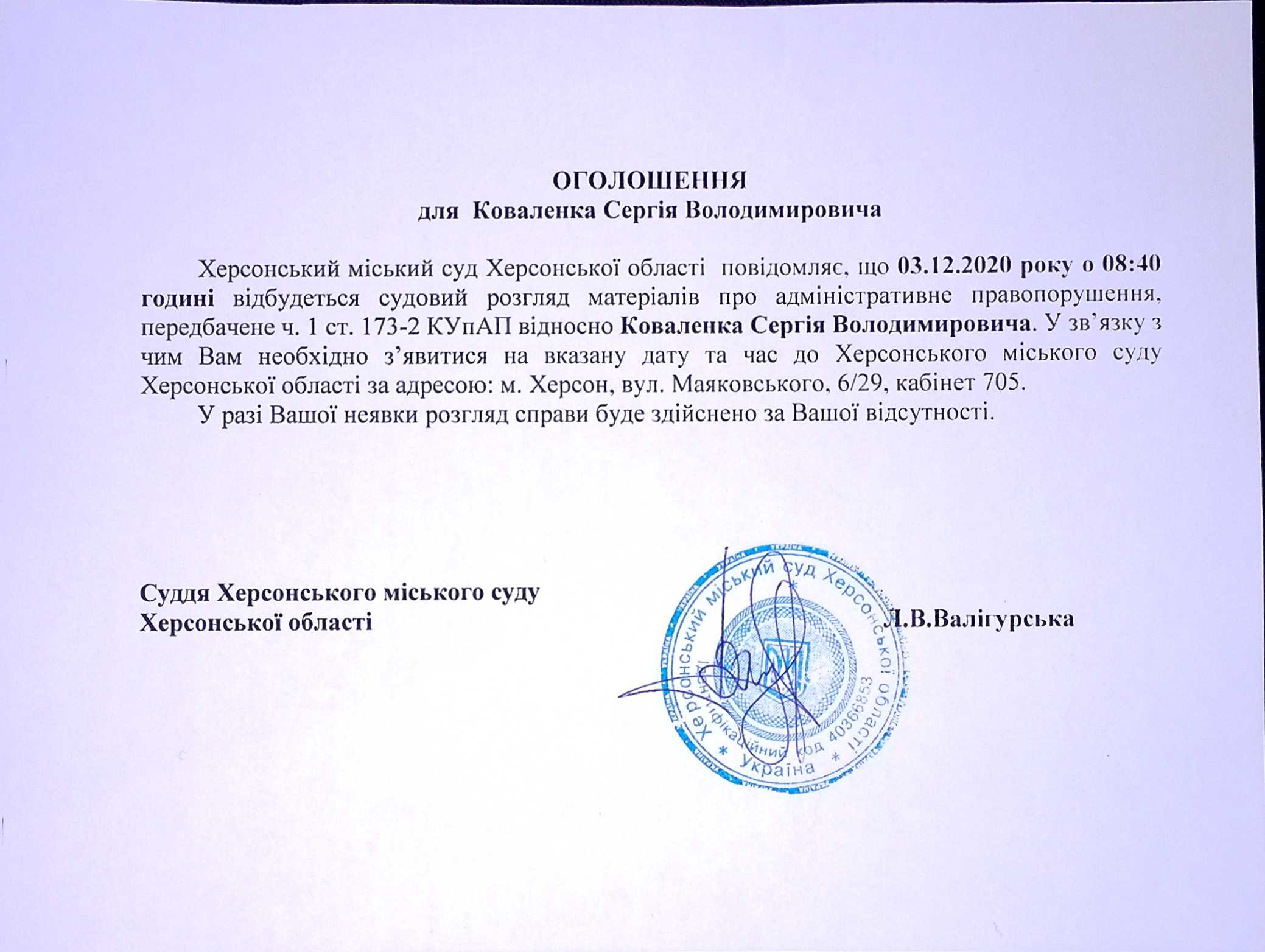 ОГОЛОШЕННЯ для Коваленко Сергія Володимировича