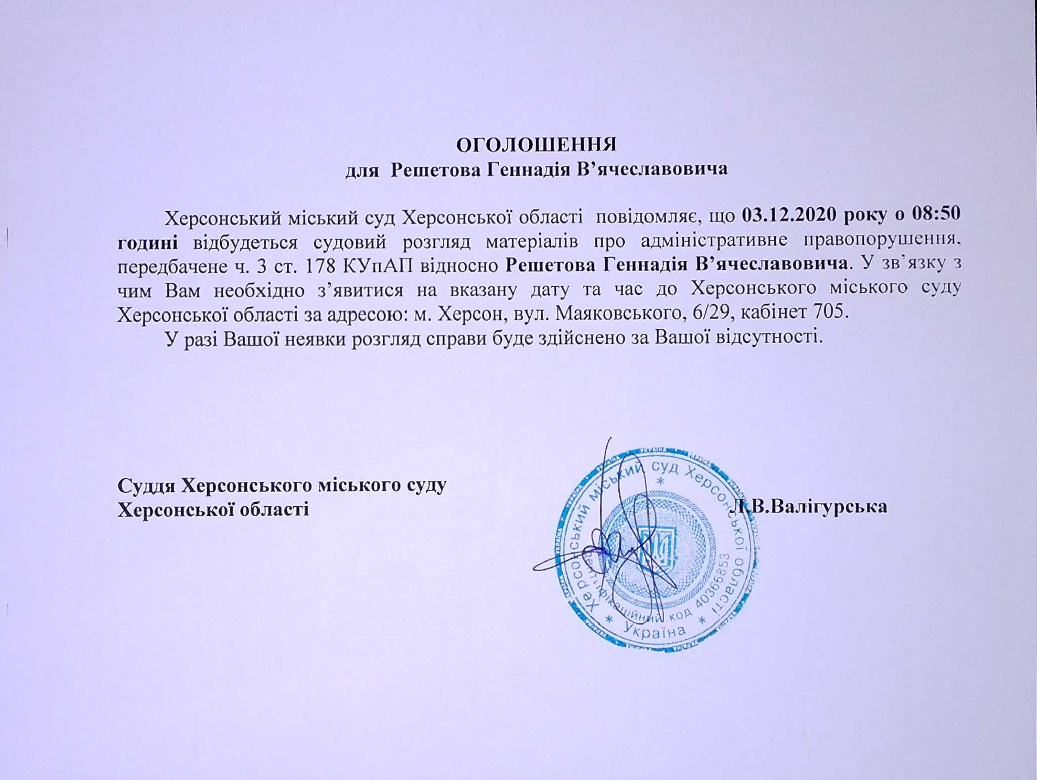 ОГОЛОШЕННЯ для Решетова Геннадія В`ячеславовича