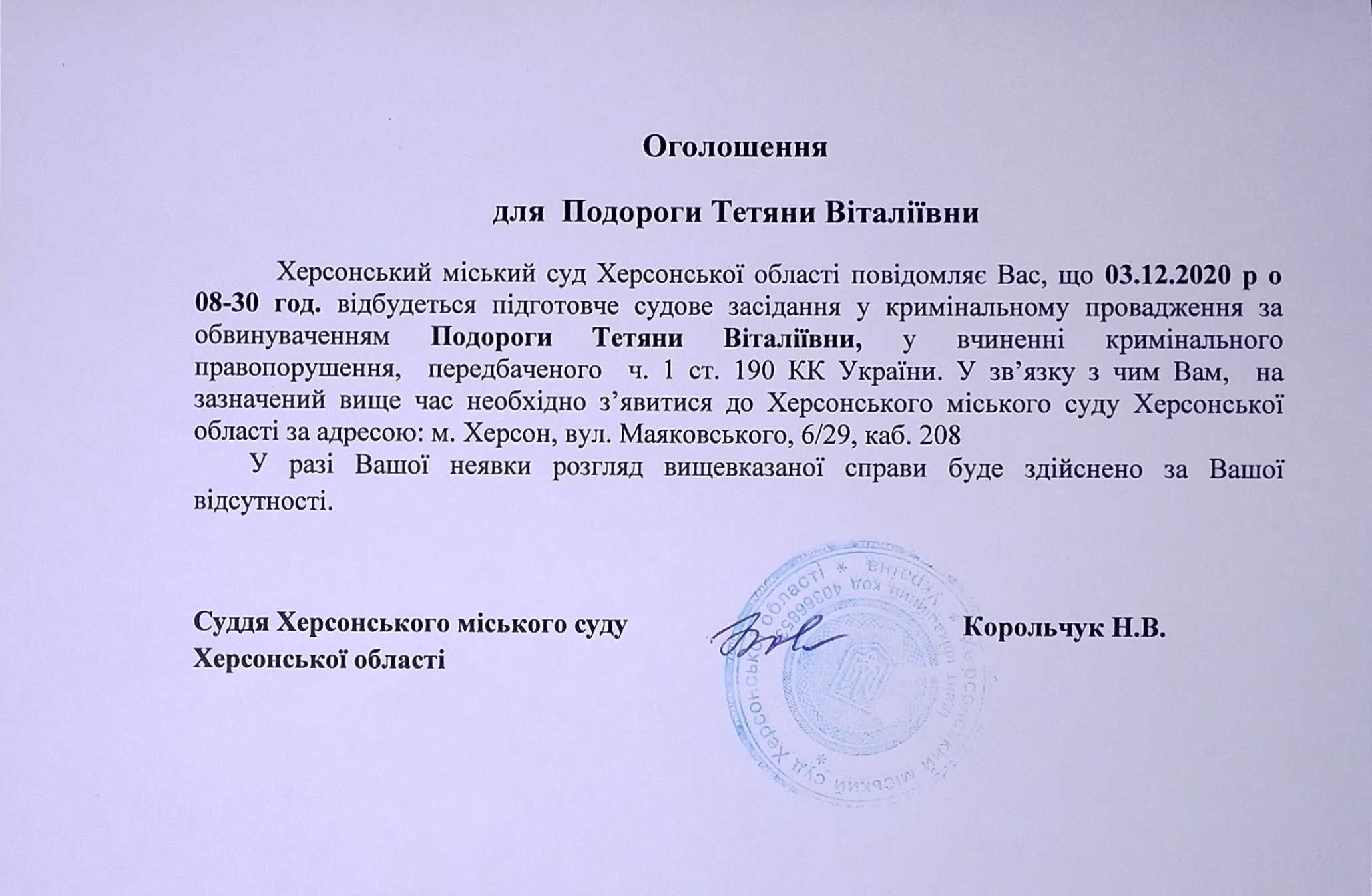 ОГОЛОШЕННЯ для Подороги Тетяни Віталіївни