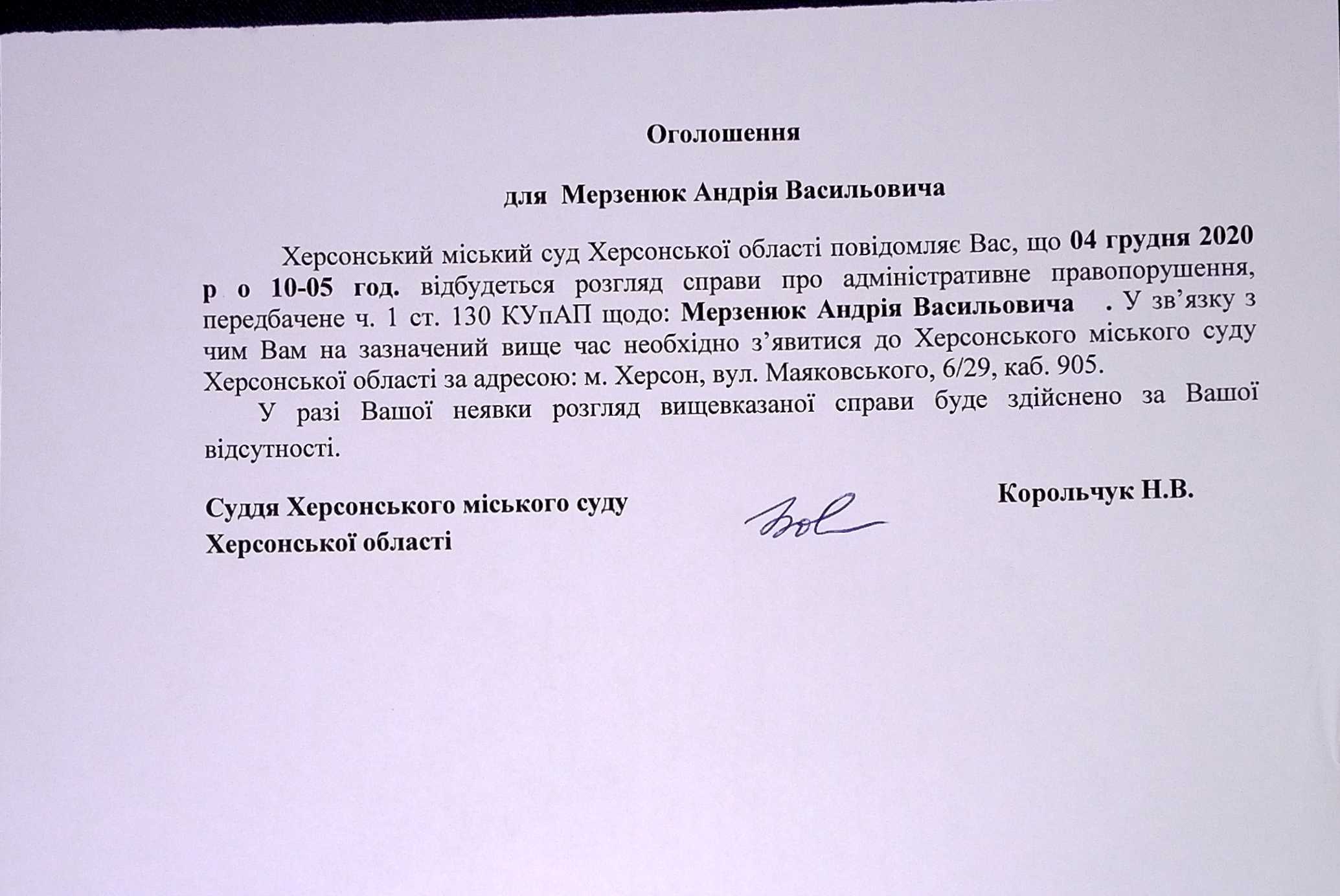 ОГОЛОШЕННЯ ПРО ВИКЛИК ДО СУДУ