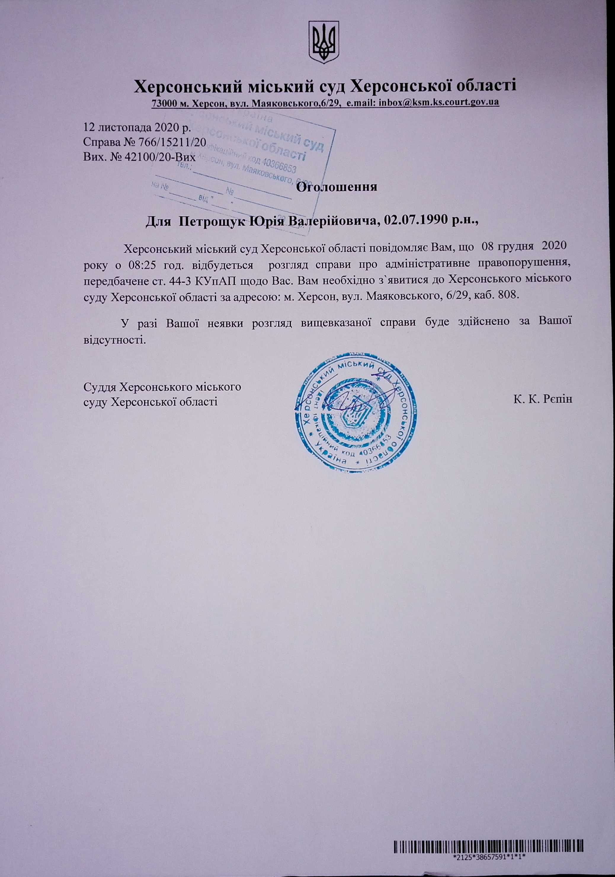 ОГОЛОШЕННЯ для Петрощук Юрія Валерійовича