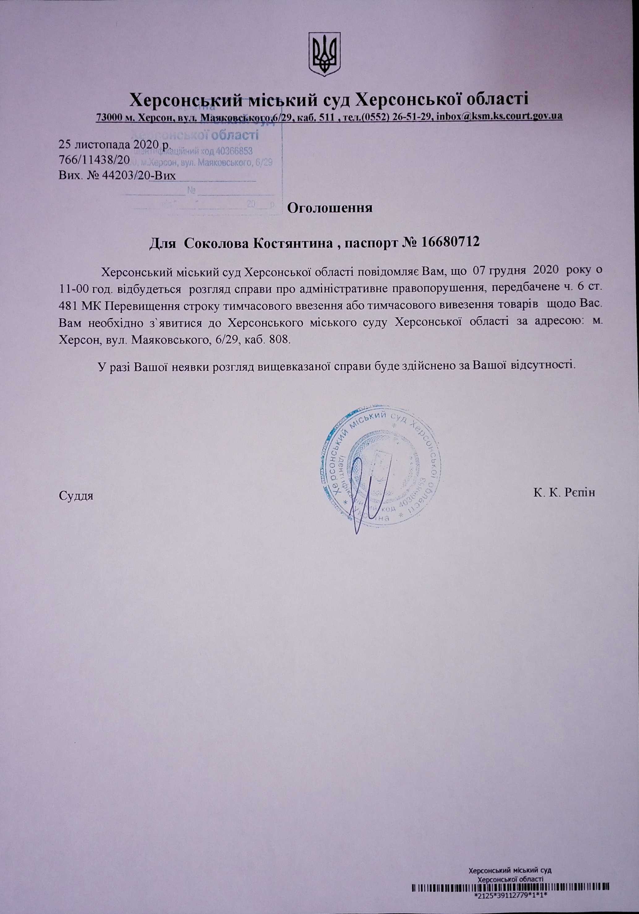 ОГОЛОШЕННЯ для Соколова Костянтина, паспорт № 16680712