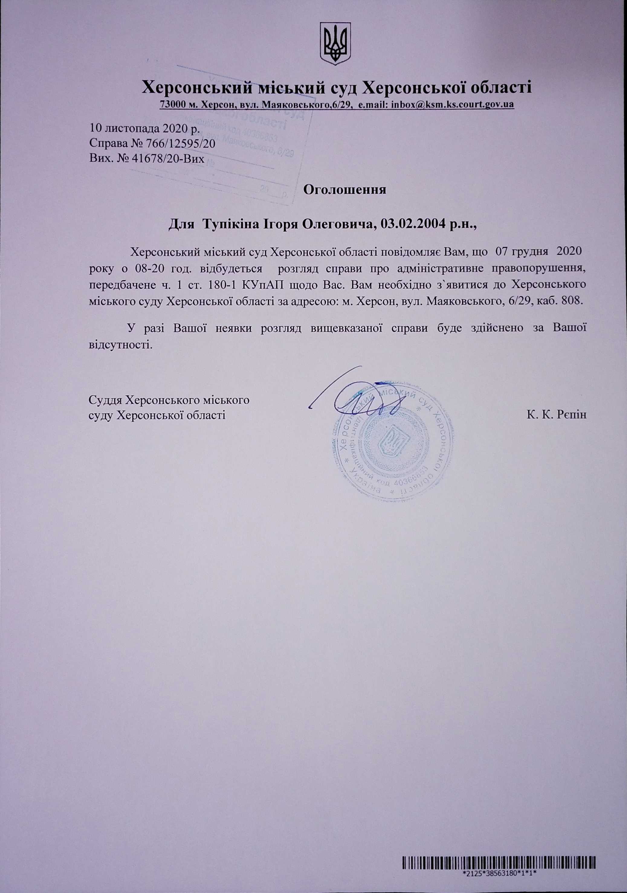 ОГОЛОШЕННЯ для Тупікіна Ігоря Олеговича