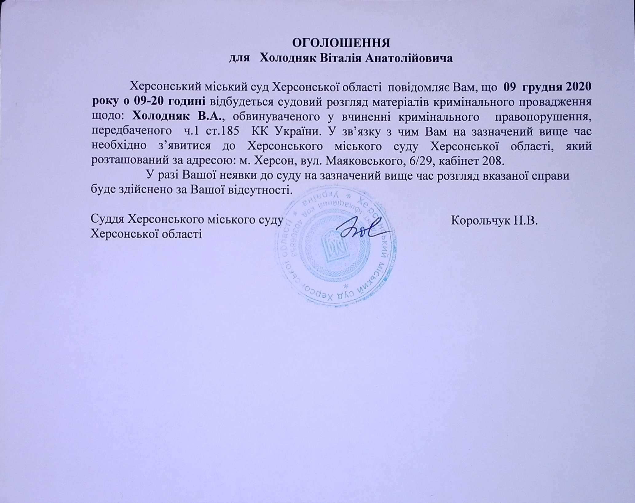 ОГОЛОШЕННЯ для Холодняк Віталія Анатолійовича