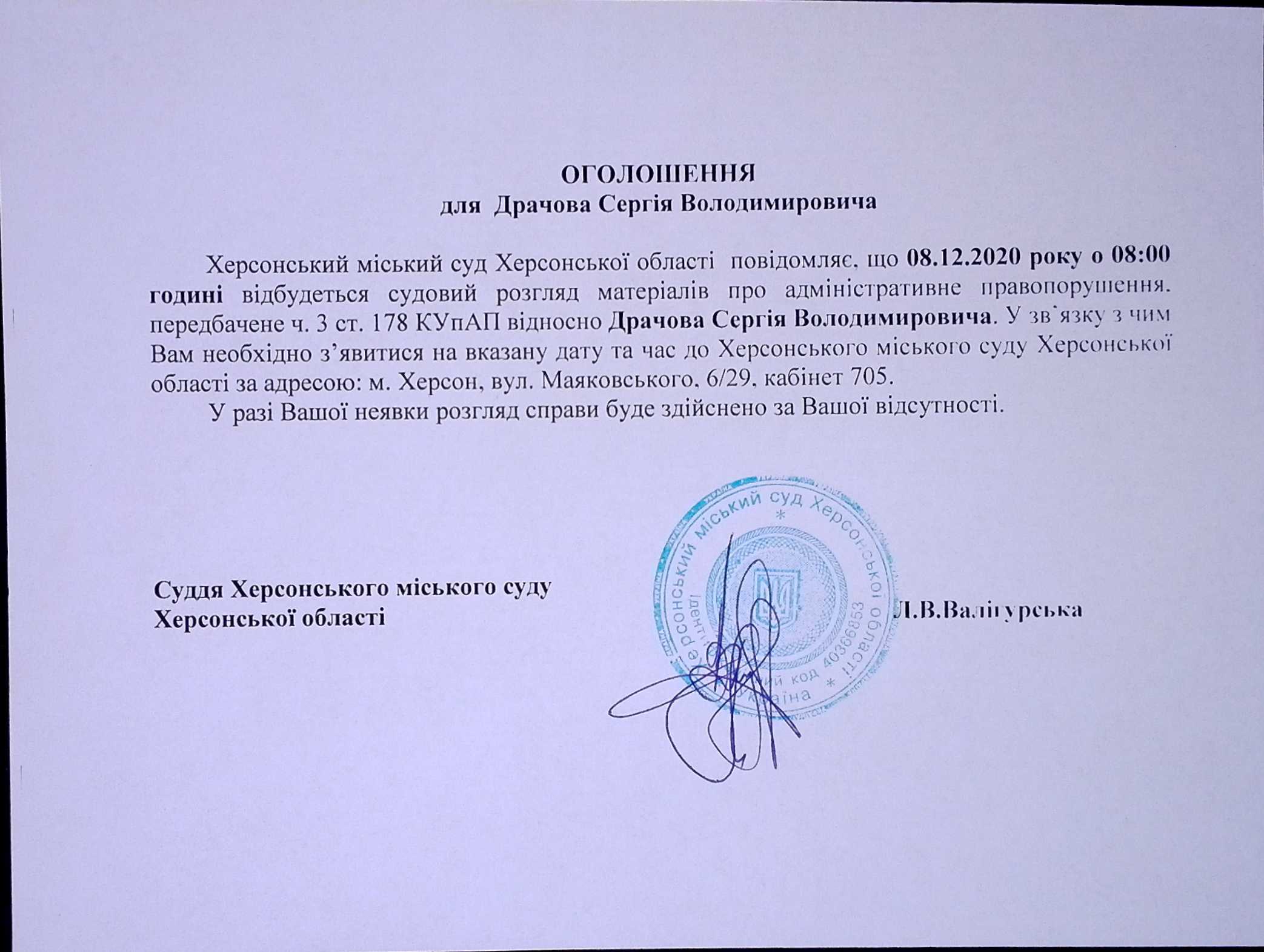 ОГОЛОШЕННЯ для Драчова Сергія Володимировича