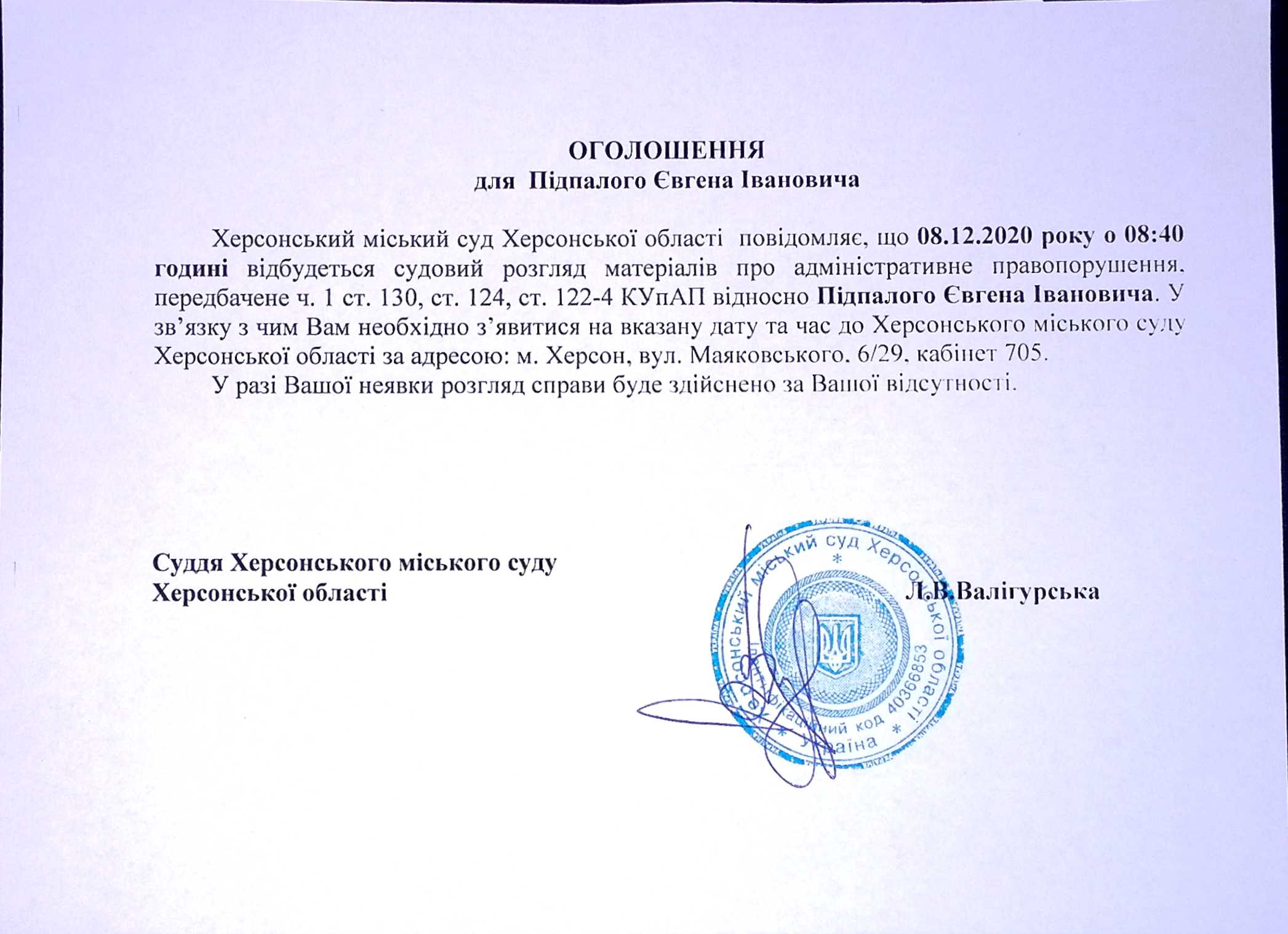 ОГОЛОШЕННЯ для Підпалого Євгена Івановича
