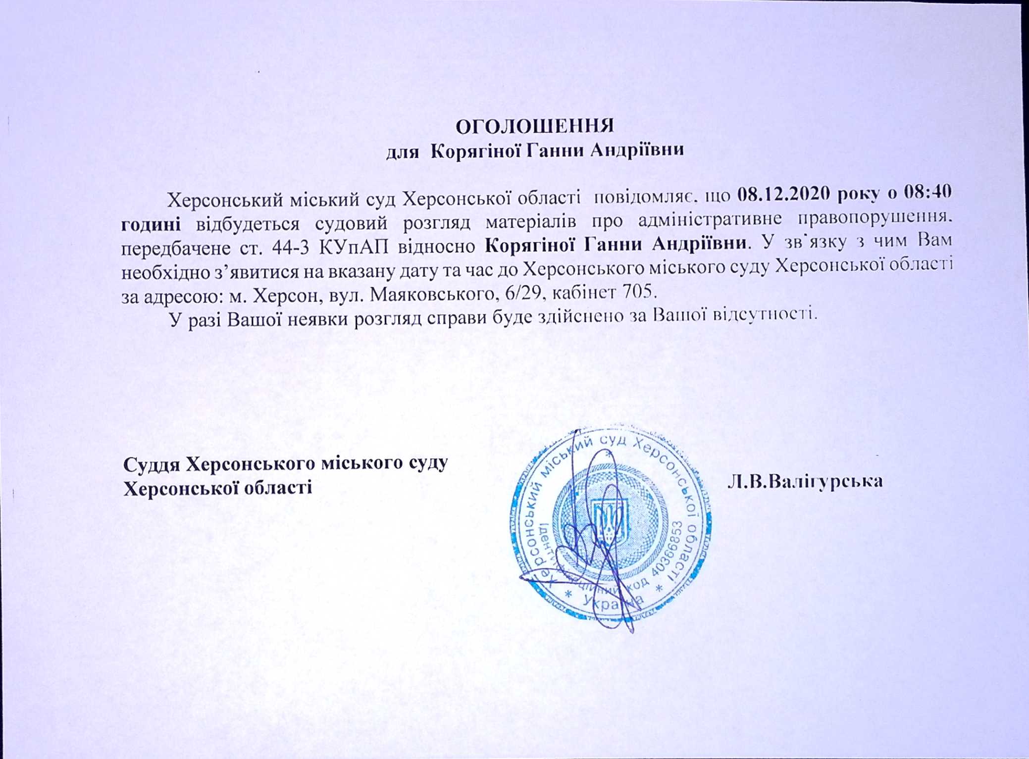 ОГОЛОШЕННЯ для Корягіної Ганни Андріївни