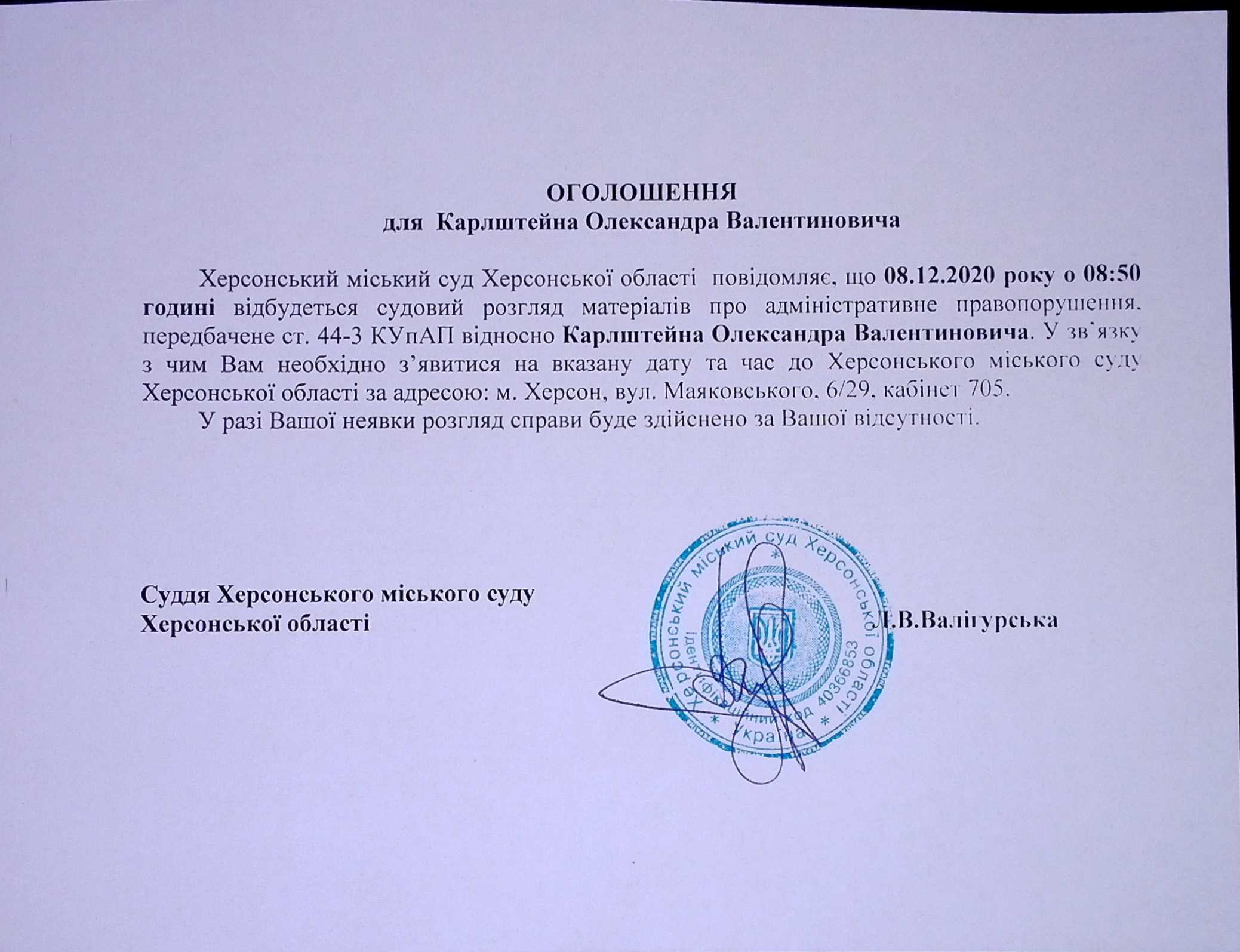ОГОЛОШЕННЯ для Карлштейна Олександра Валентиновича