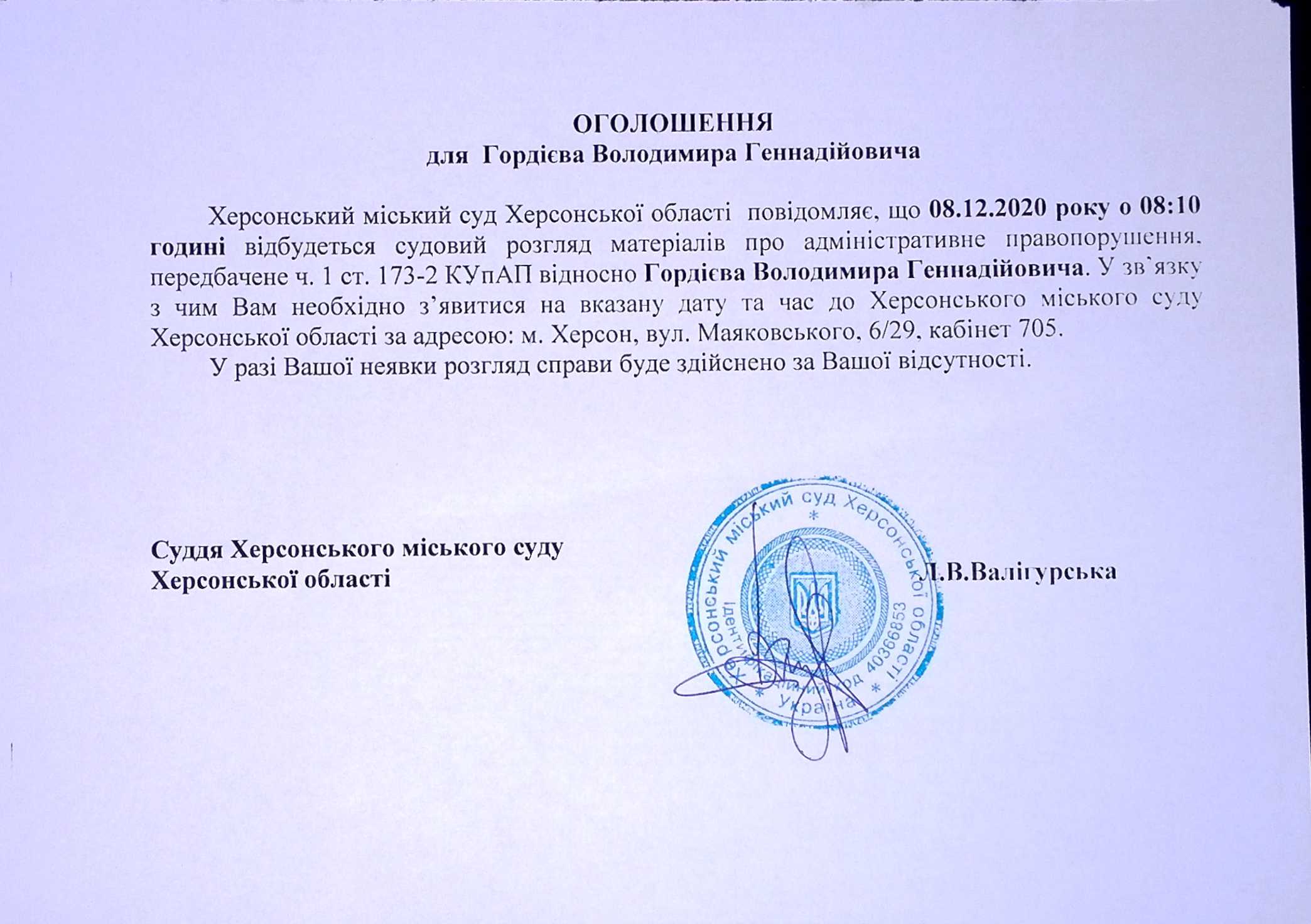 ОГОЛОШЕННЯ для Гордієва Володимира Геннадійовича