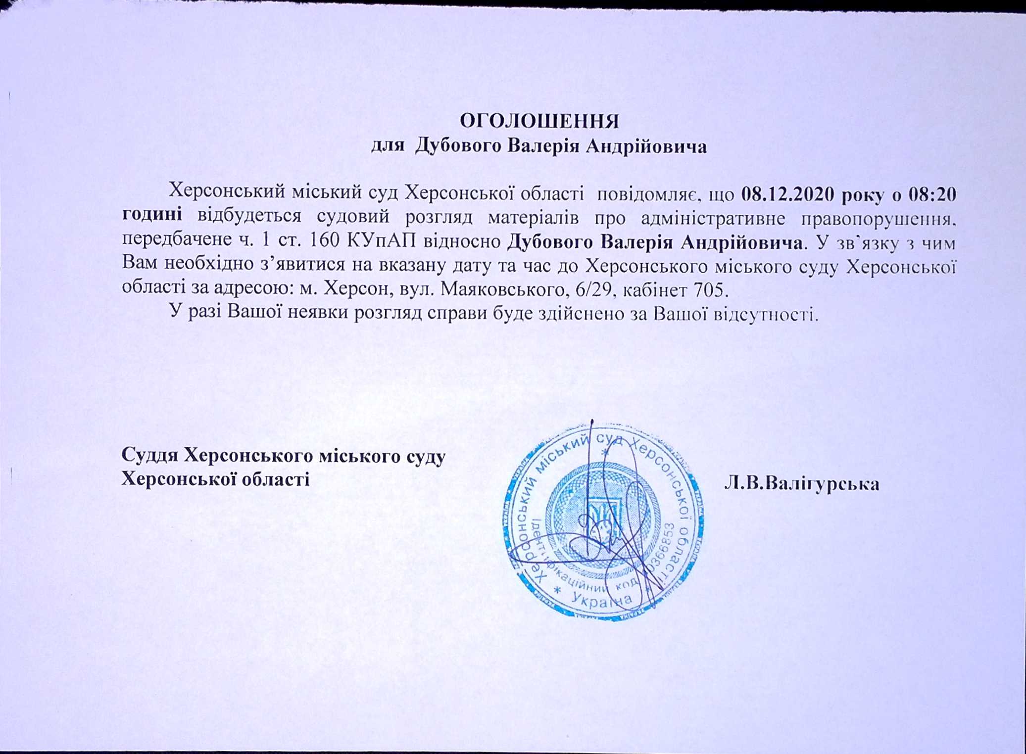 ОГОЛОШЕННЯ для Дубового Валерія Андрійовича