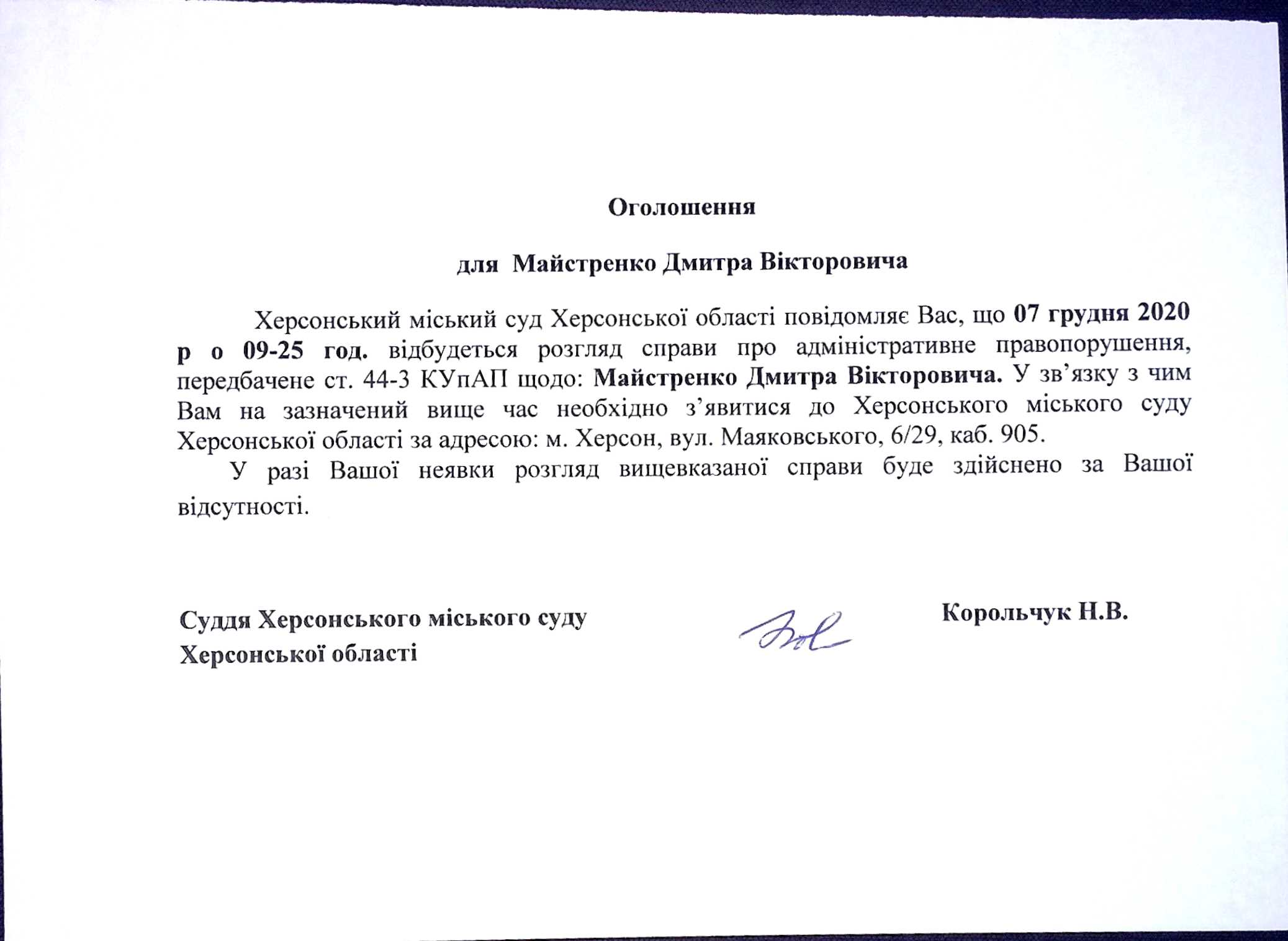 ОГОЛОШЕННЯ для Майстренко Дмитра Вікторовича