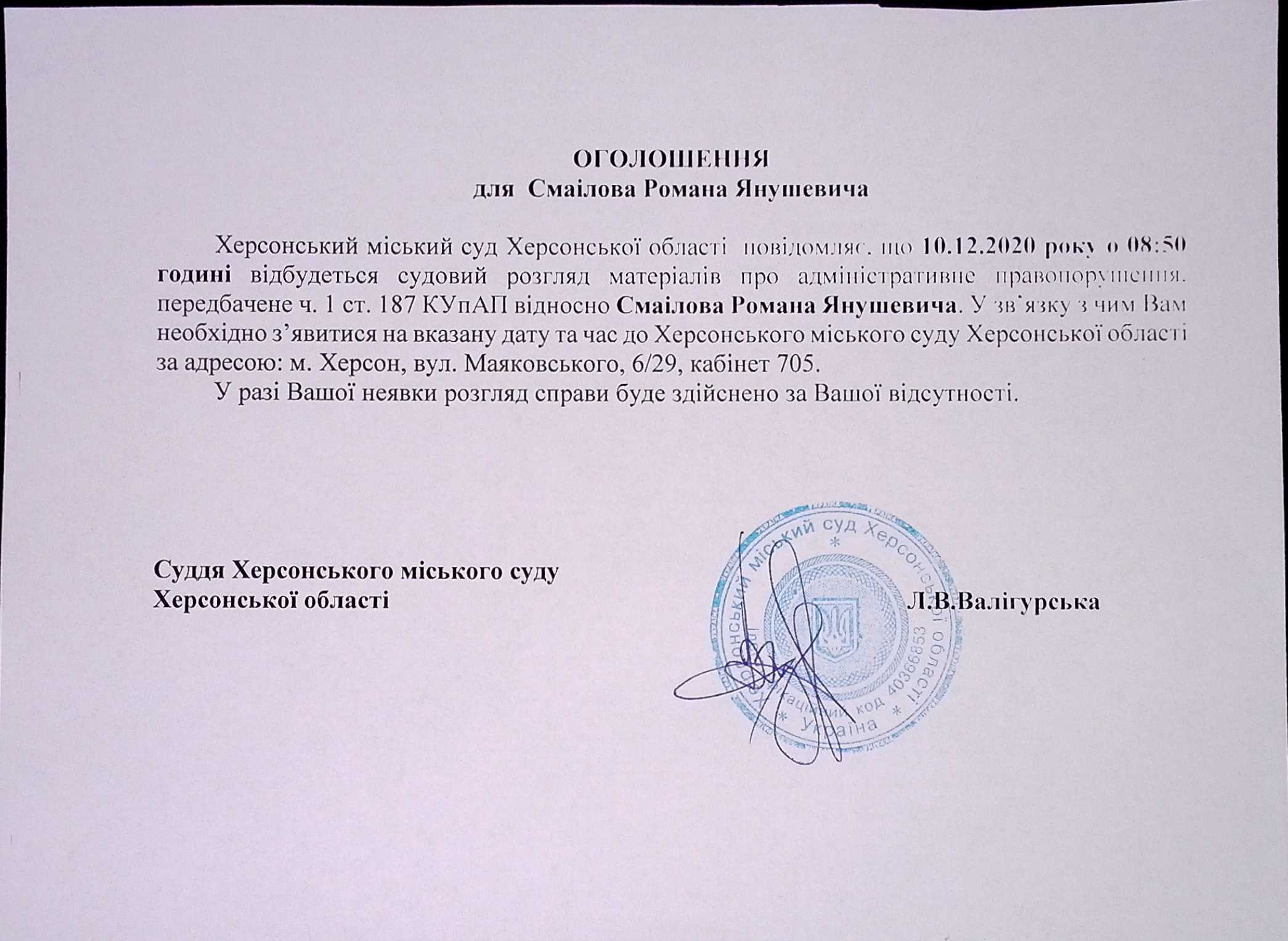 ОГОЛОШЕННЯ для Смаілова Романа Янушевича