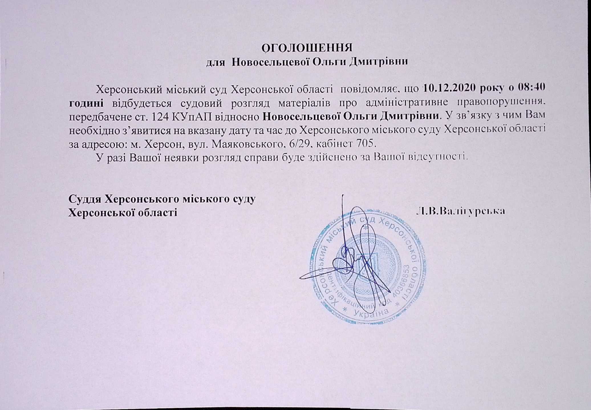 ОГОЛОШЕННЯ для Новосельцевої Ольги Дмитрівни