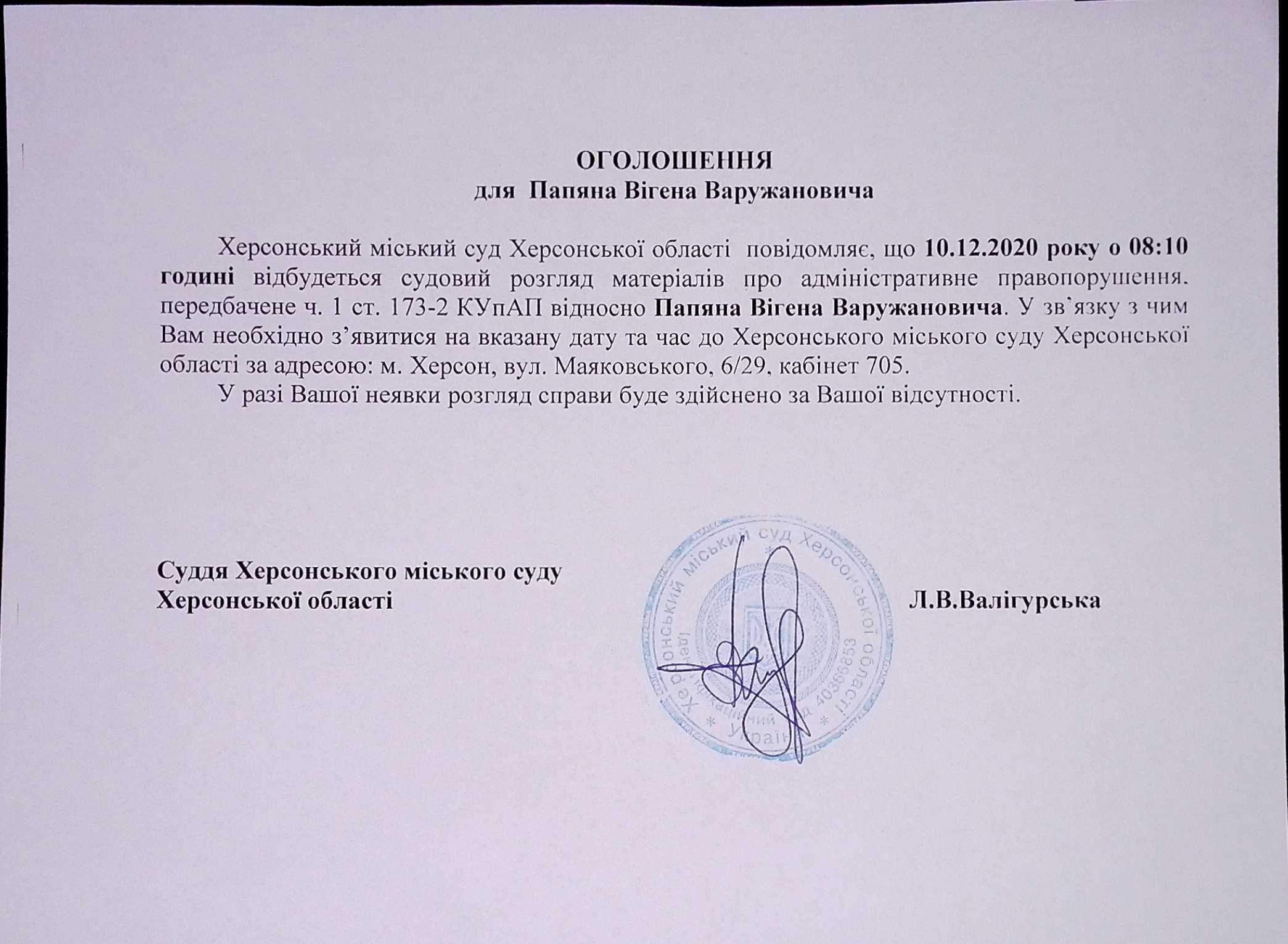 ОГОЛОШЕННЯ для Папяна Вігена Варужановича