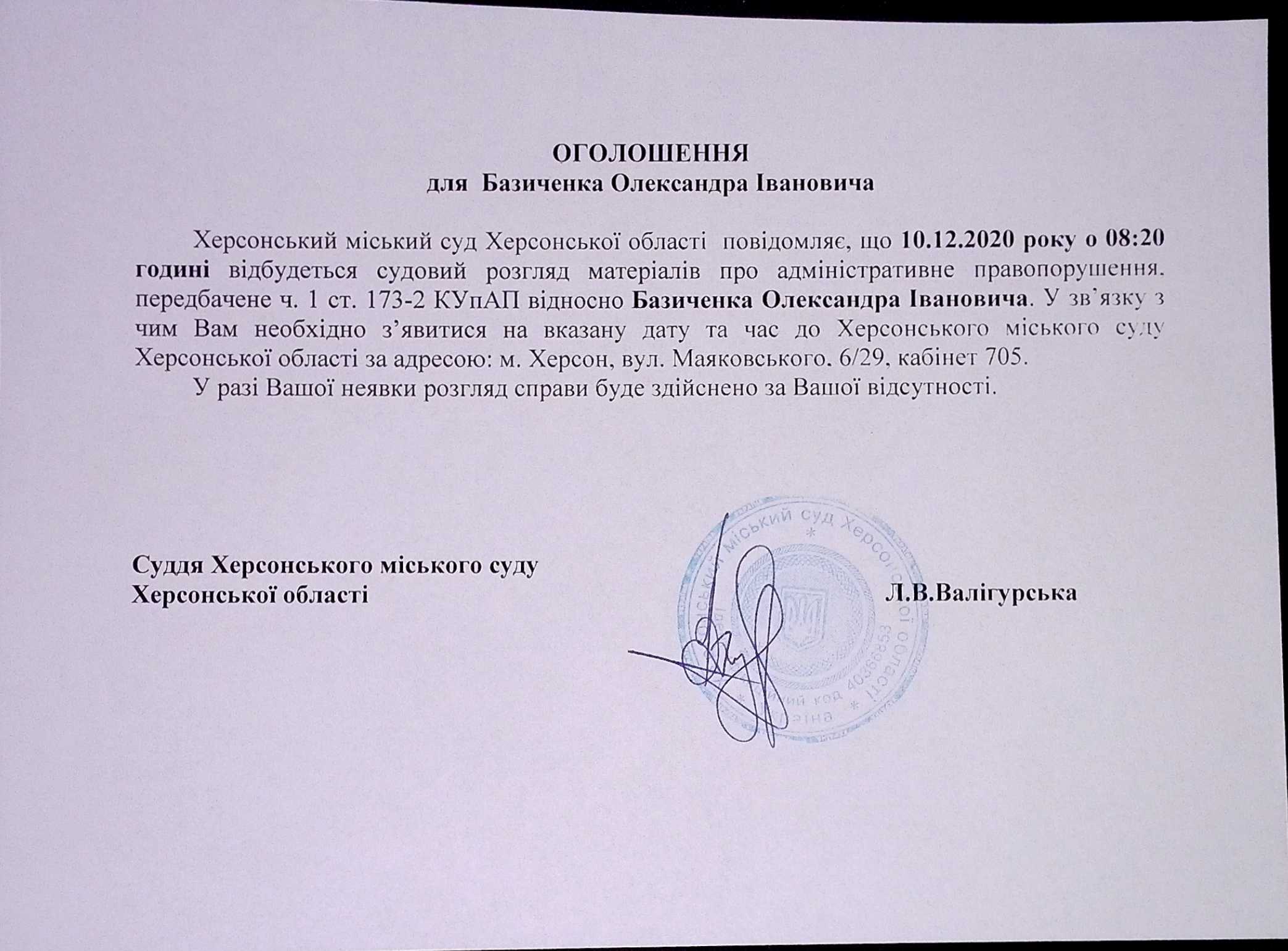 ОГОЛОШЕННЯ для Базиченка Олександра Івановича