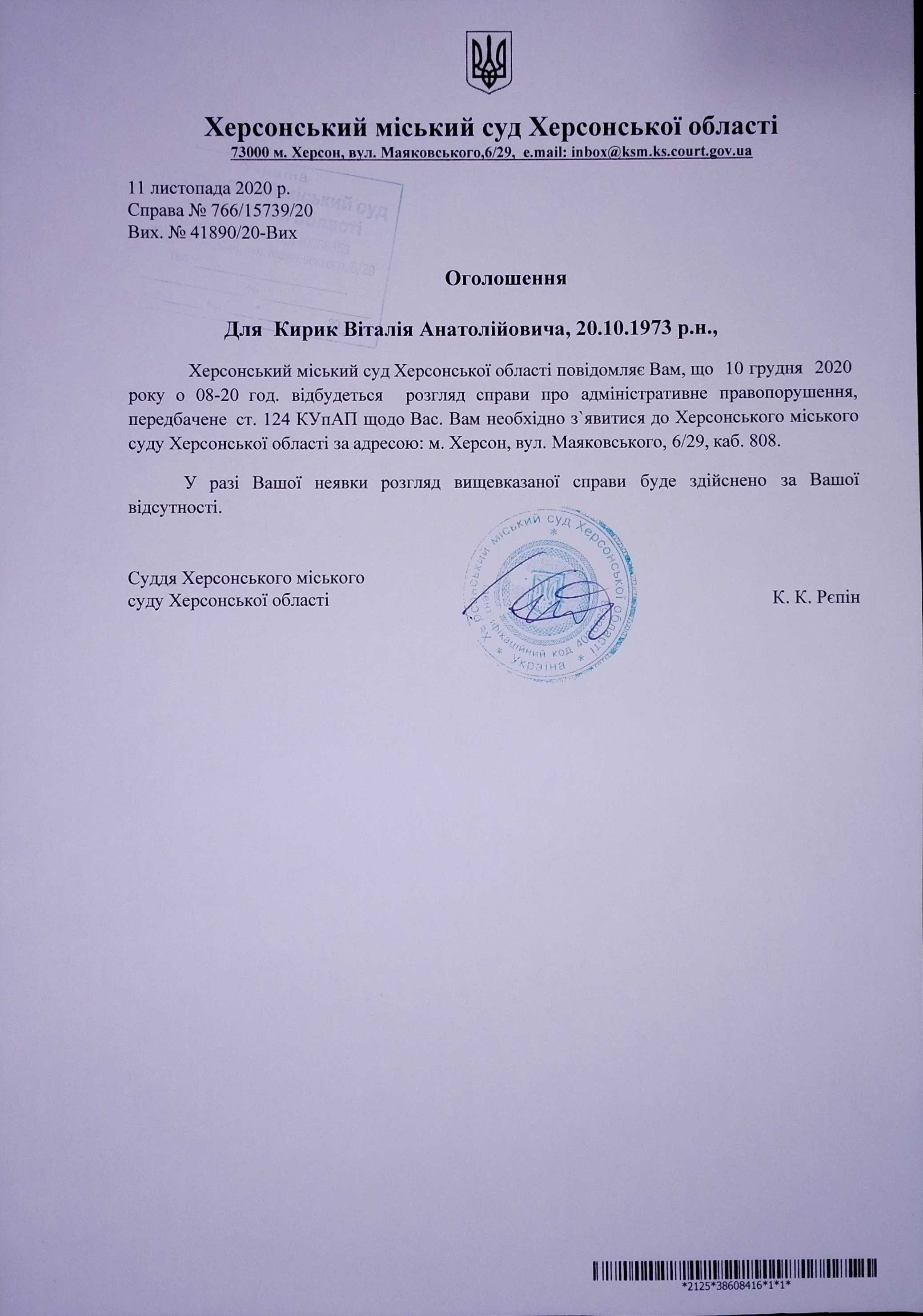 ОГОЛОШЕННЯ для Кирик Віталія Анатолійовича