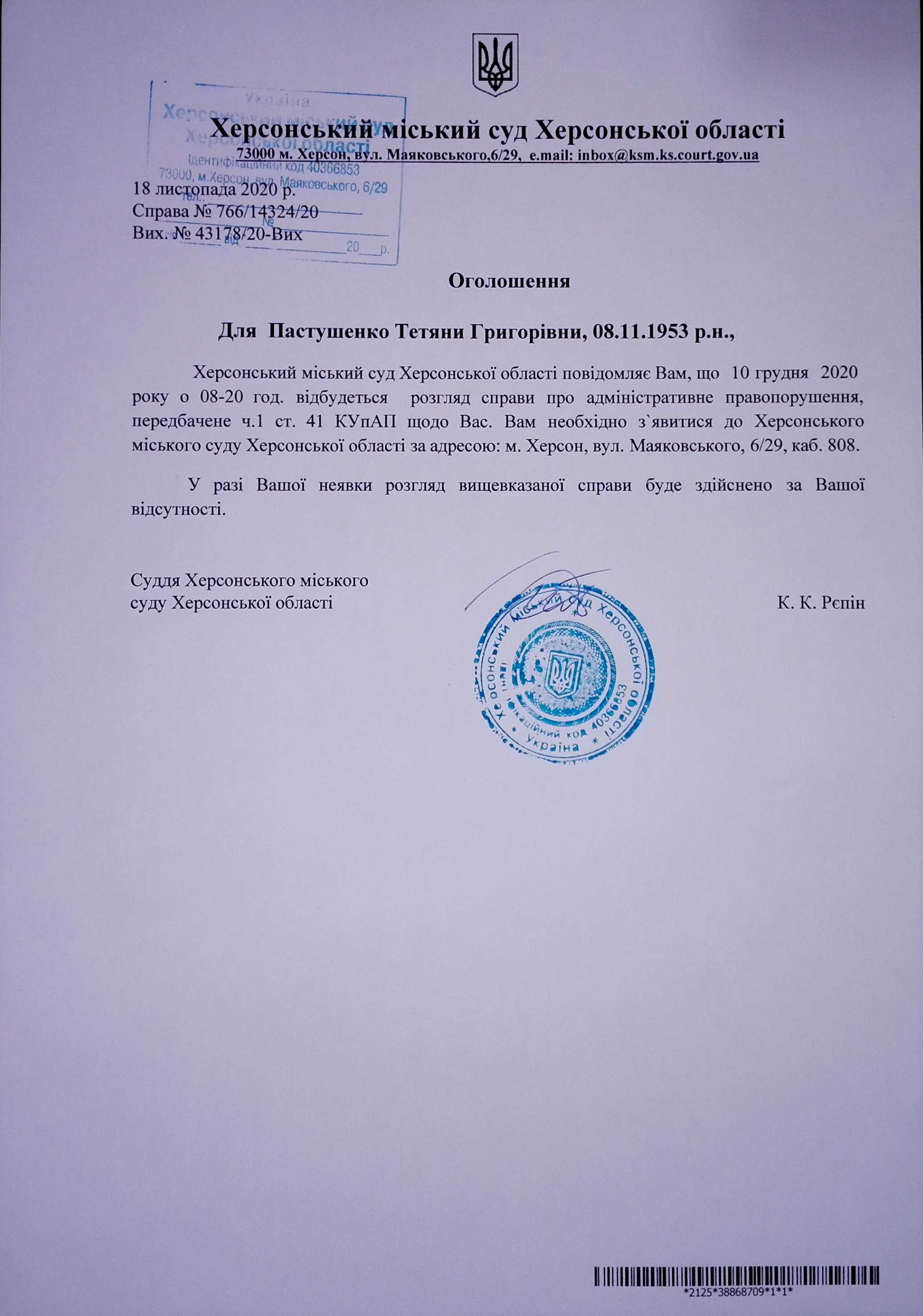 Оголошення про виклик особи в суд та повідомлення про судове рішення