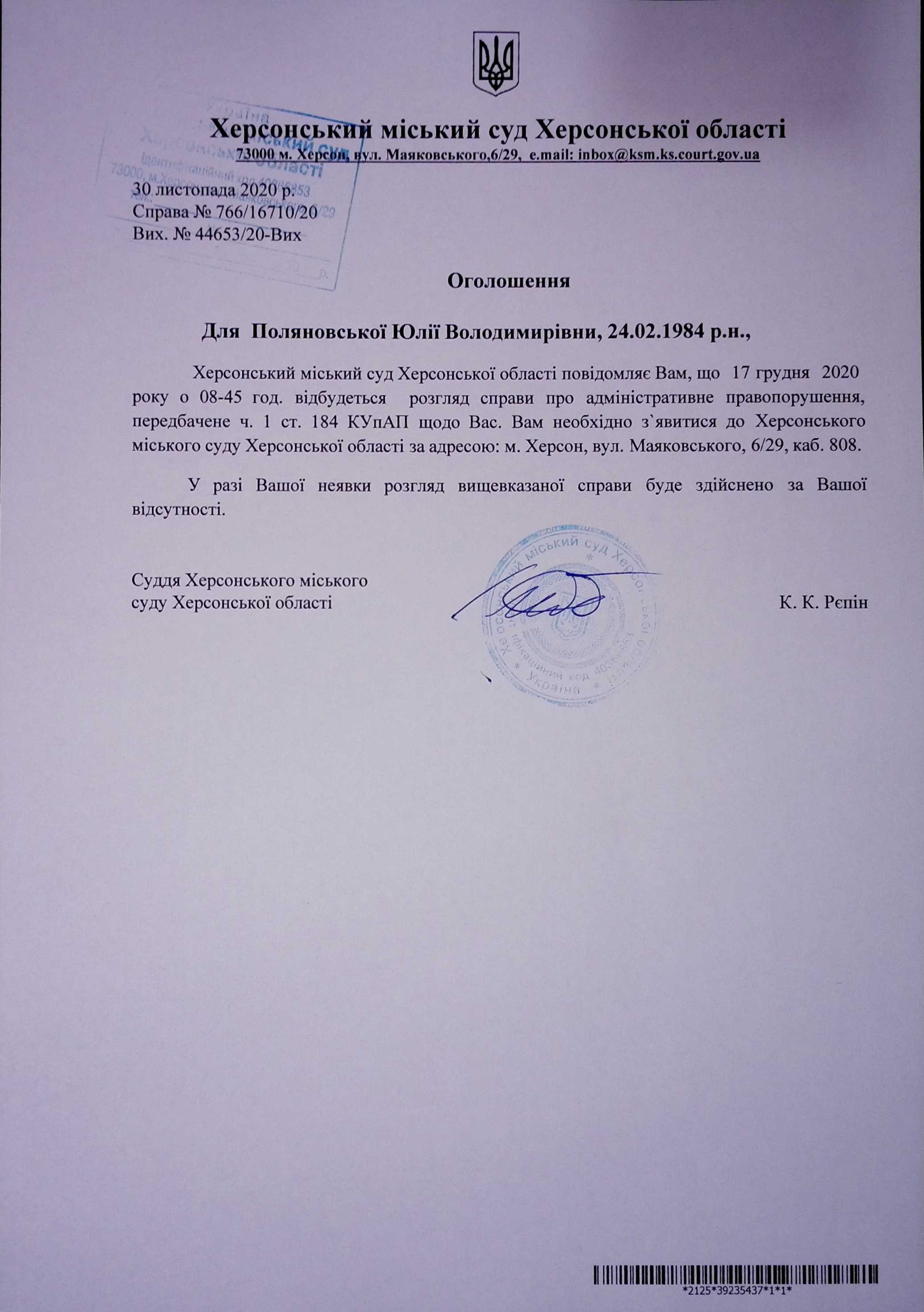 ОГОЛОШЕННЯ для Поляновської Юлії Володимирівни