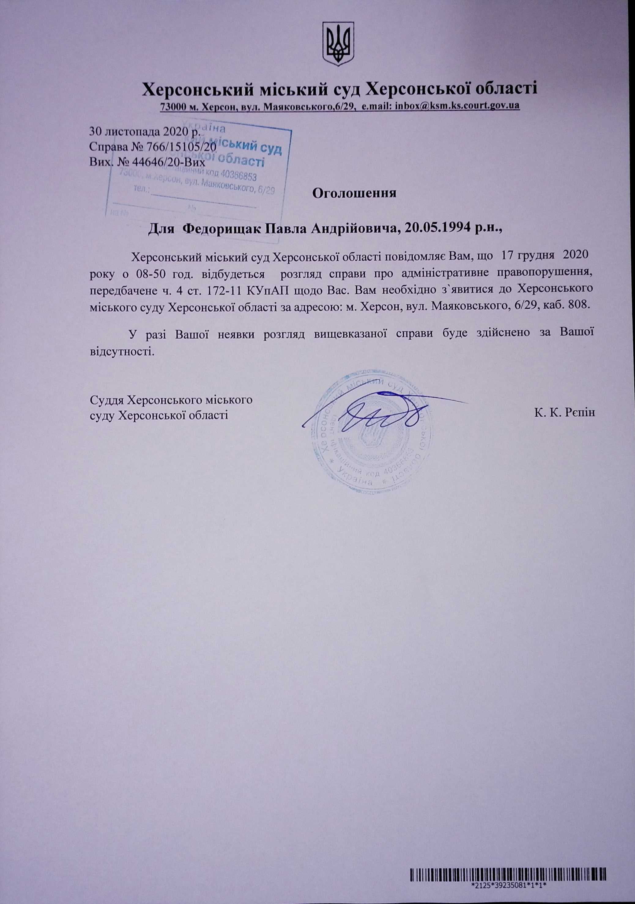 ОГОЛОШЕННЯ ПРО ВИКЛИК ДО СУДУ