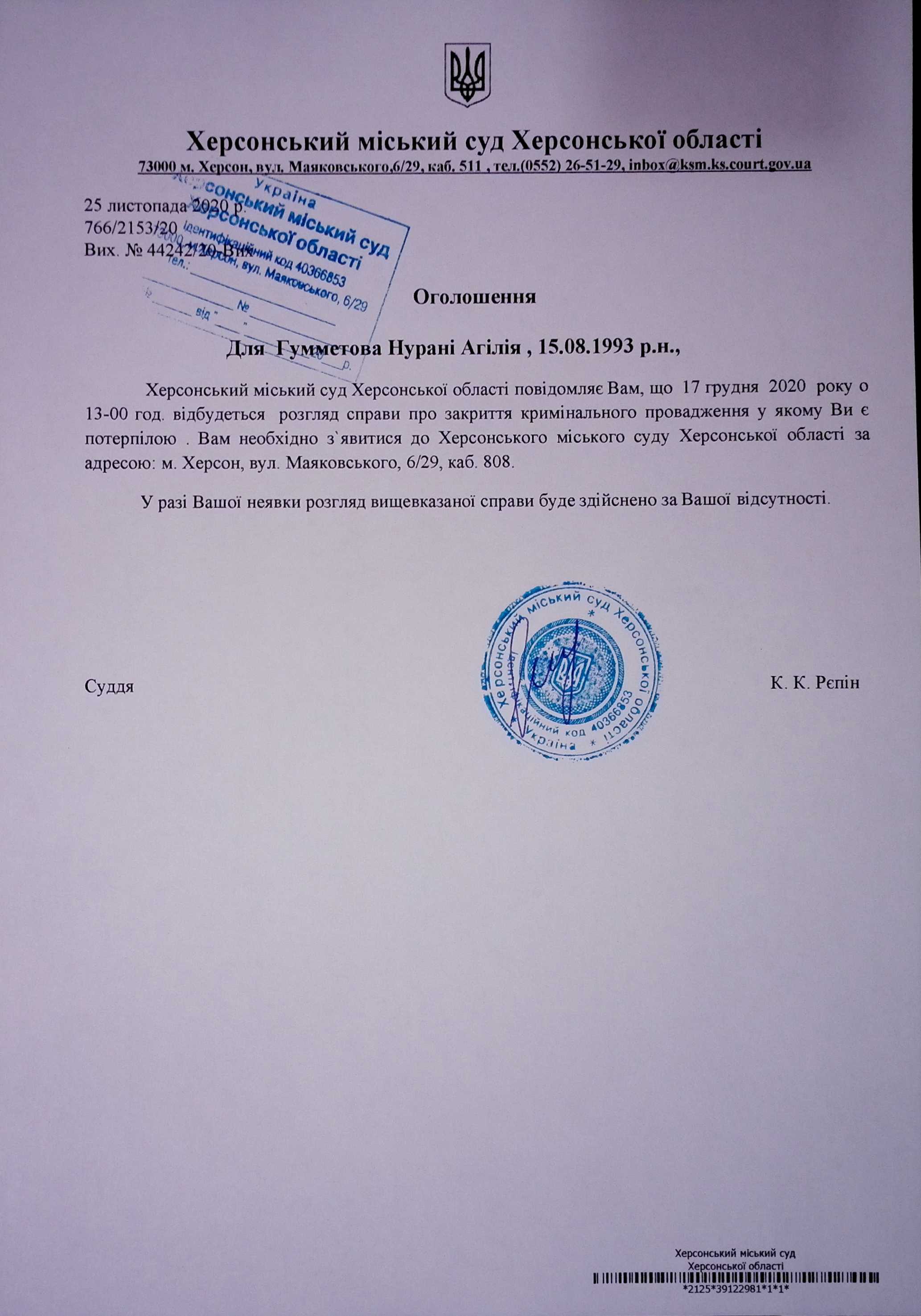 ОГОЛОШЕННЯ для Гумметова Нурані Агілія