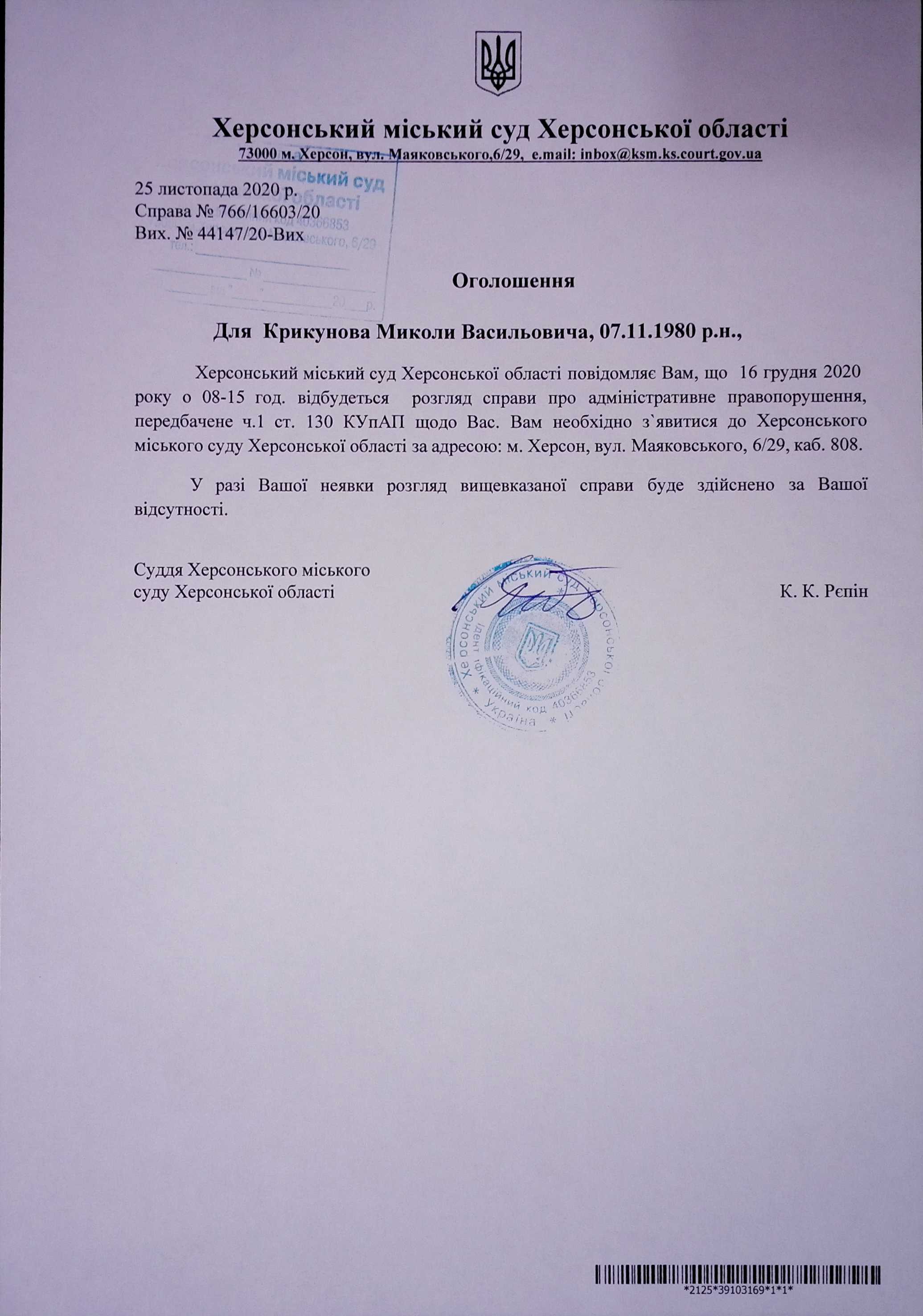 ОГОЛОШЕННЯ для Крикунова Миколи Васильовича