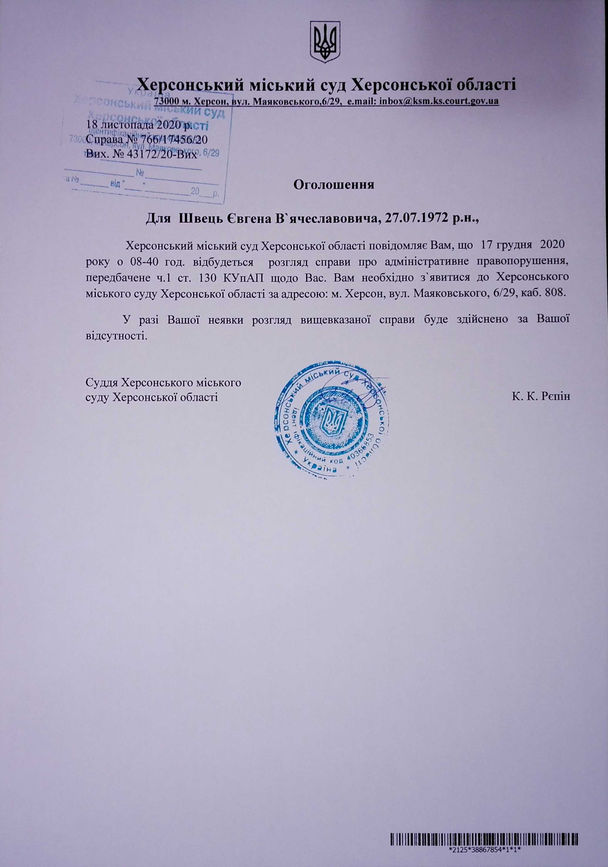 ОГОЛОШЕННЯ ПРО ВИКЛИК ДО СУДУ