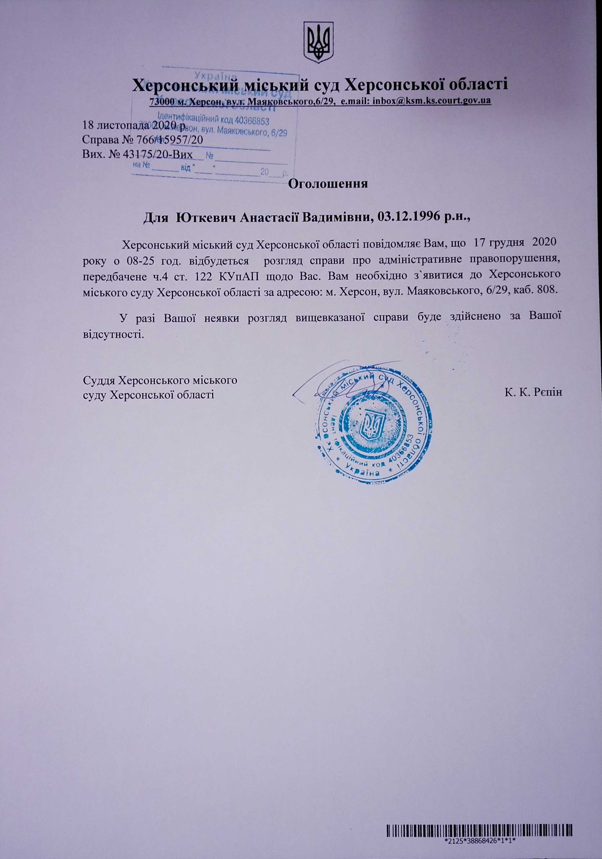 ОГОЛОШЕННЯ для Юткевич Анастасії Вадимівни