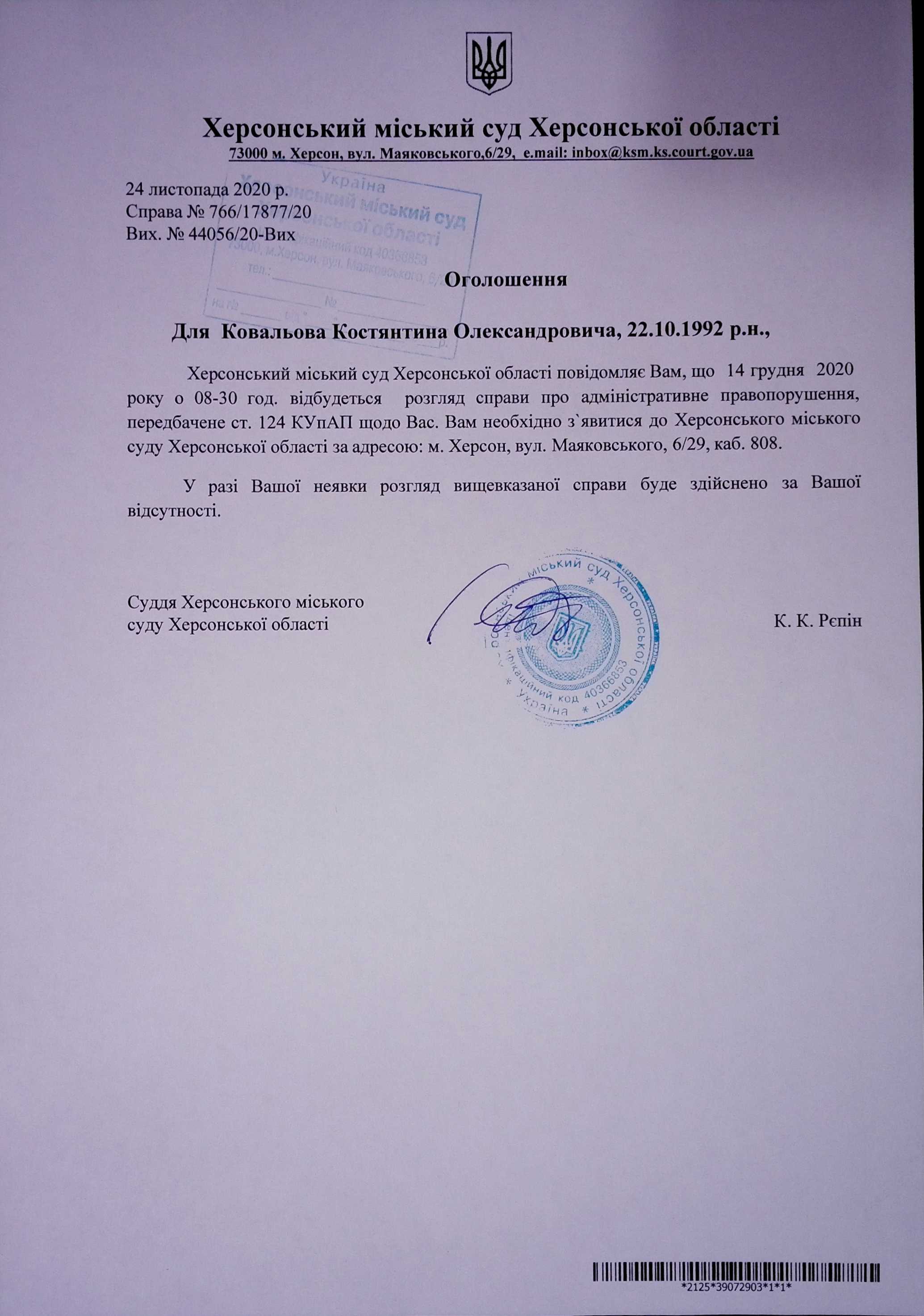 ОГОЛОШЕННЯ для Ковальова Костянтина Олександровича