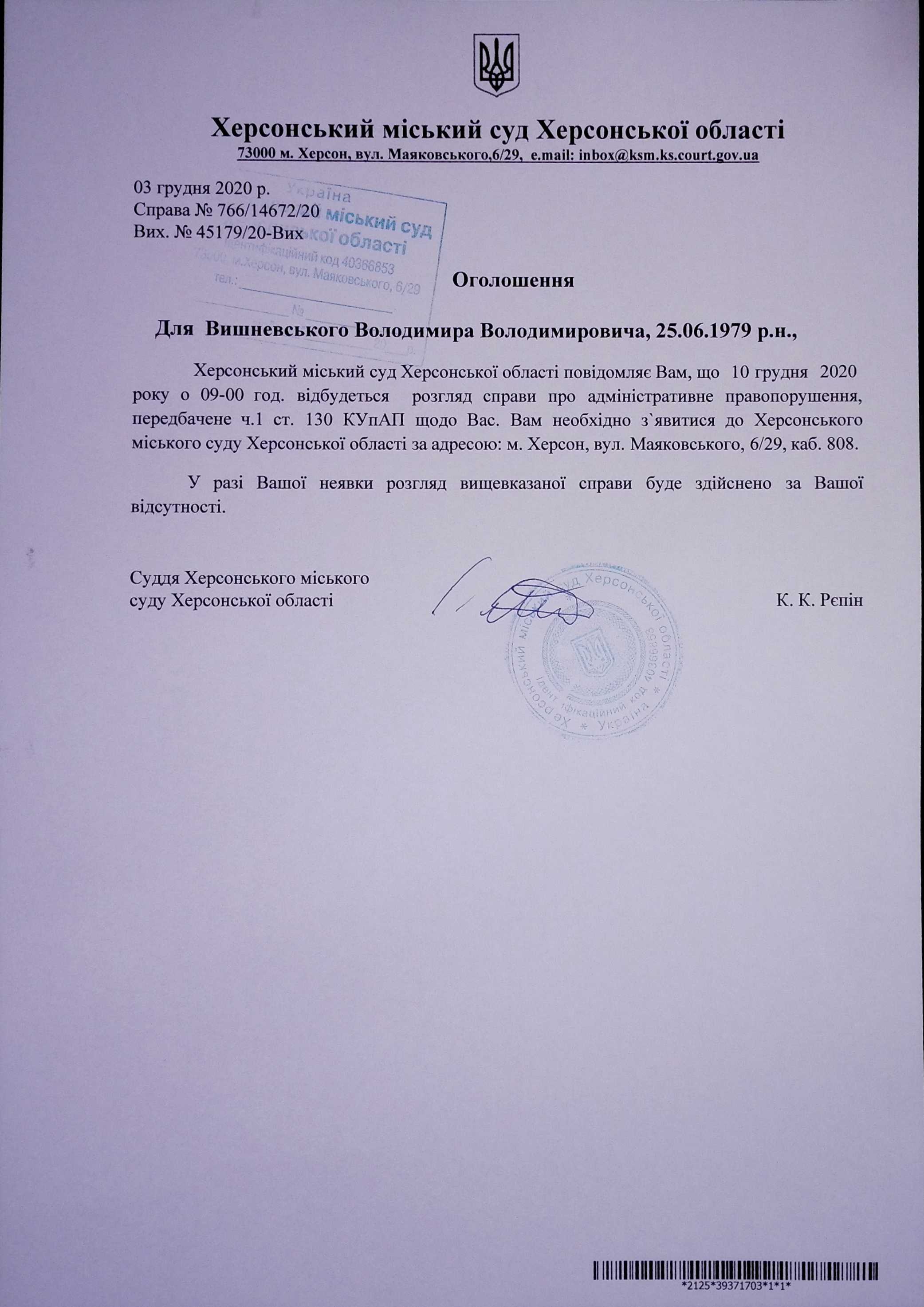 ОГОЛОШЕННЯ для Вишневського Володимира Володимировича
