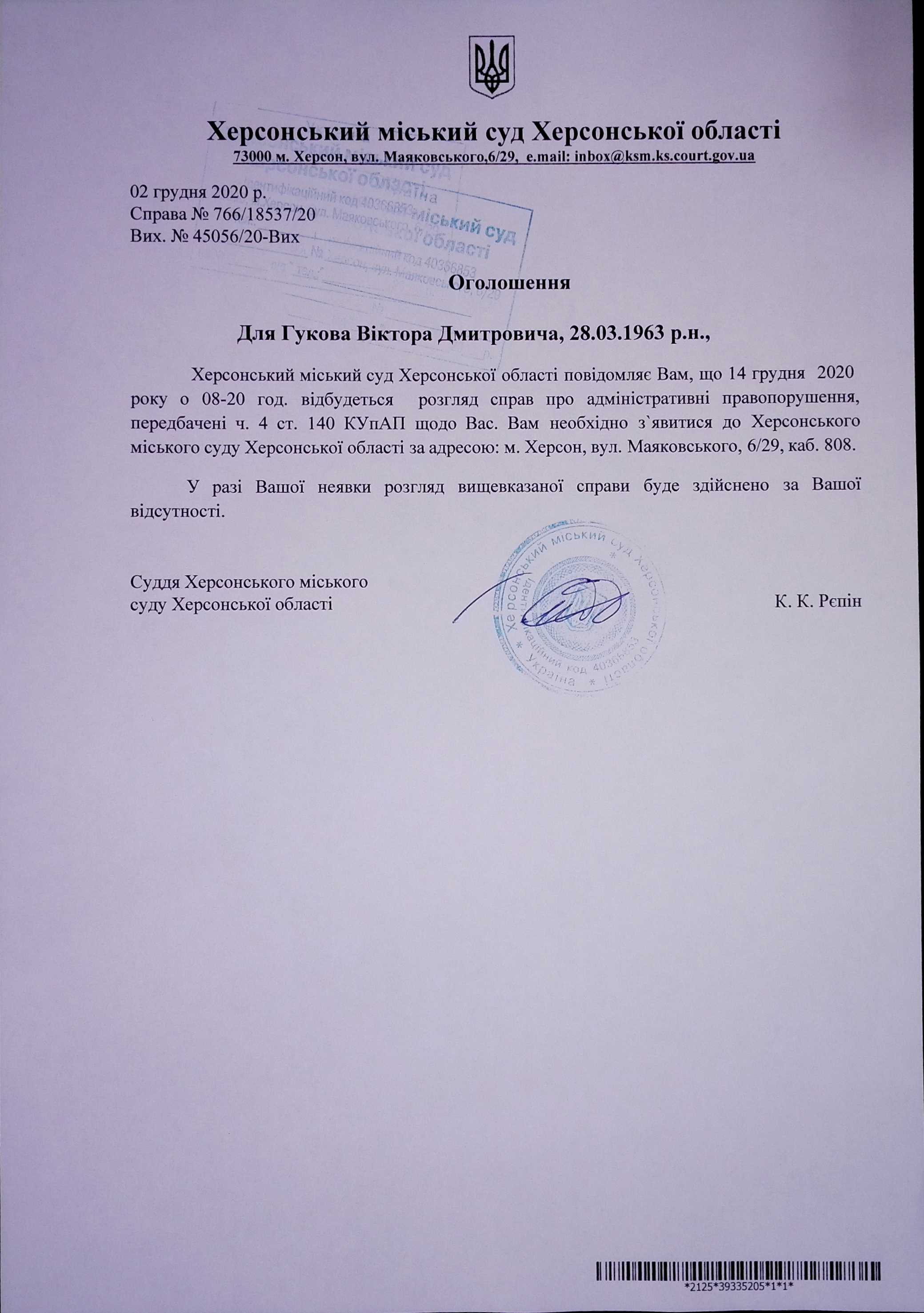 ОГОЛОШЕННЯ ПРО ВИКЛИК ДО СУДУ