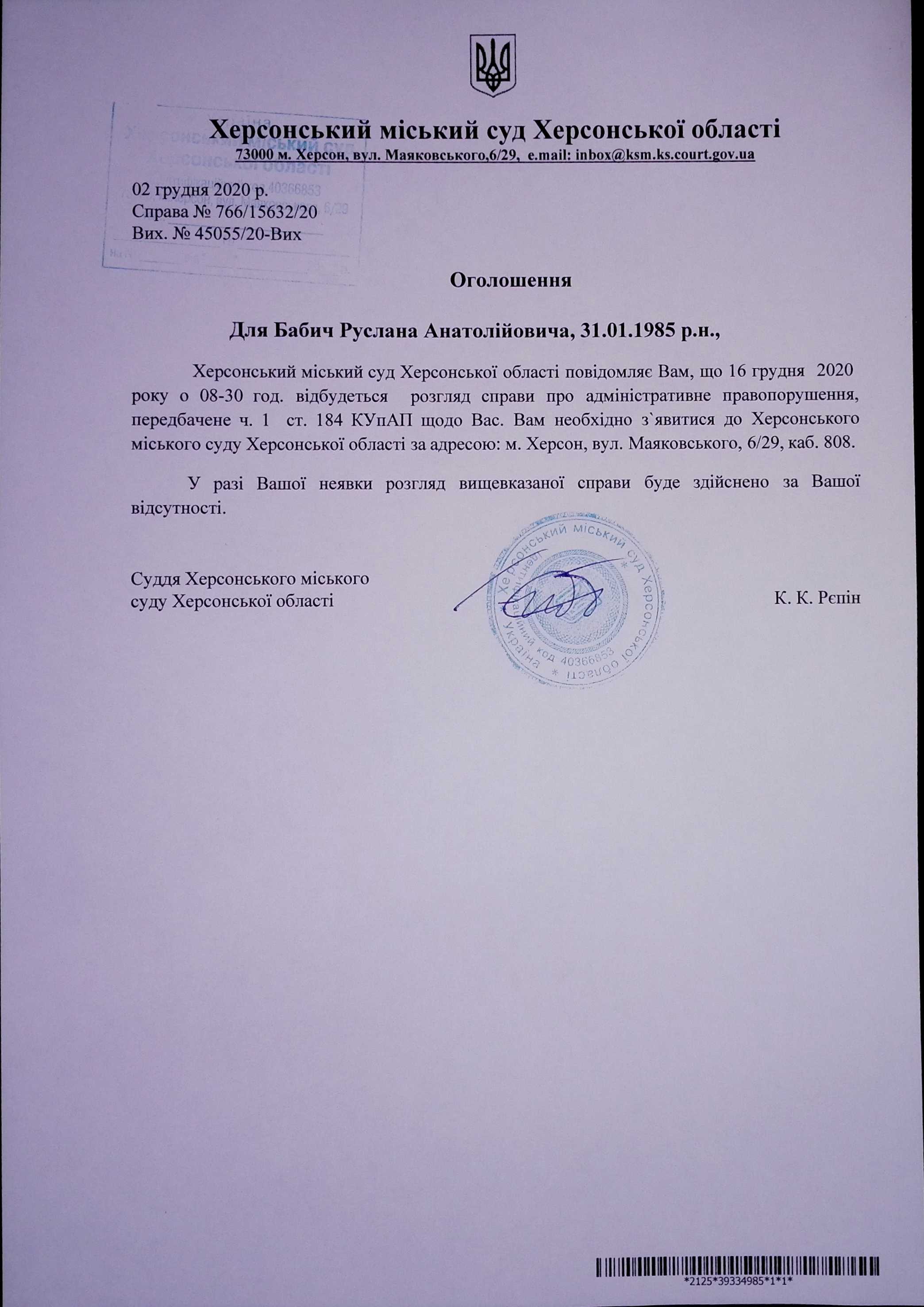 ОГОЛОШЕННЯ для Бабич Руслана Анатолійовича