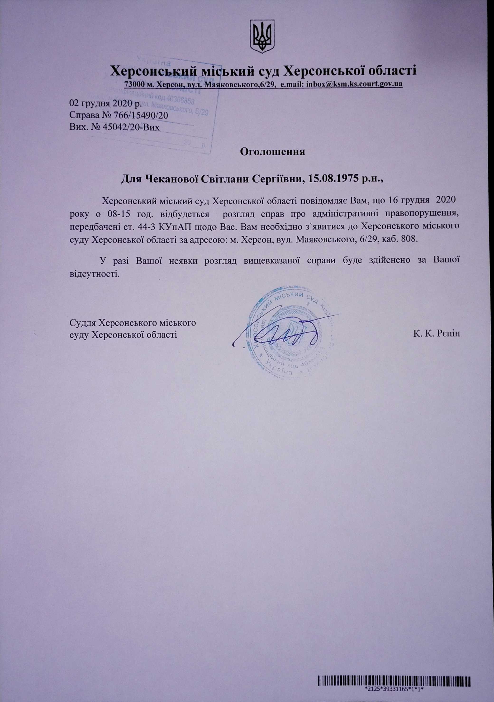 ОГОЛОШЕННЯ для Чеканової Світлани Сергіївни