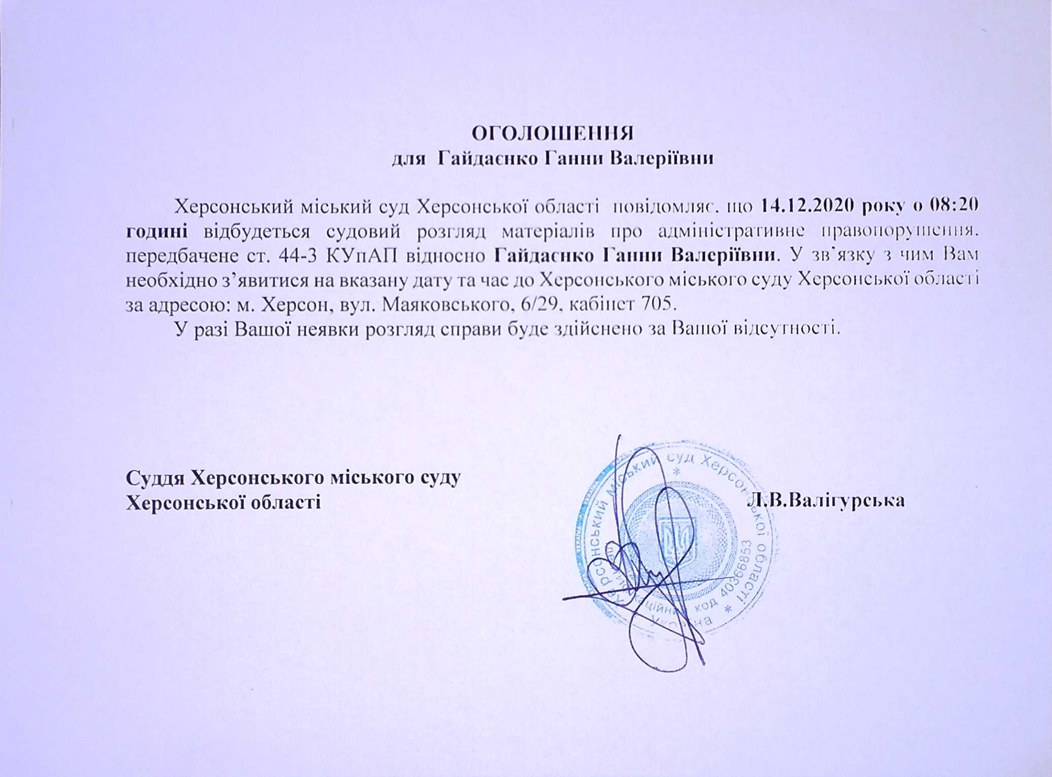 ОГОЛОШЕННЯ для Гайдаєнко Ганни Валеріївни