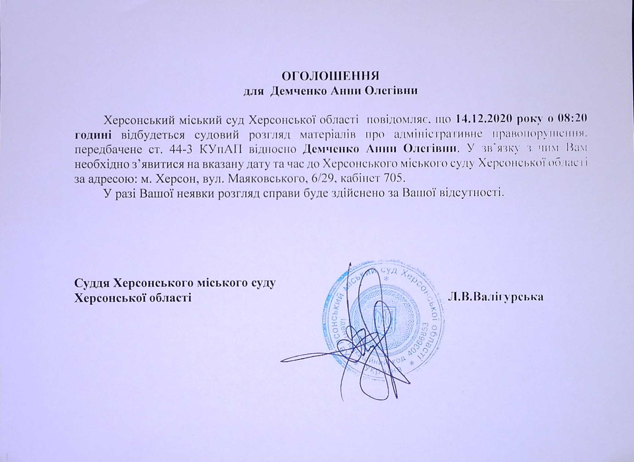 ОГОЛОШЕННЯ для Демченко Анни Олегівни
