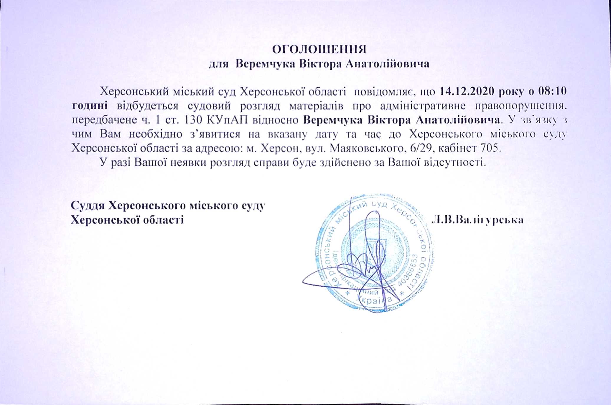ОГОЛОШЕННЯ для Веремчука Віктора Анатолійовича