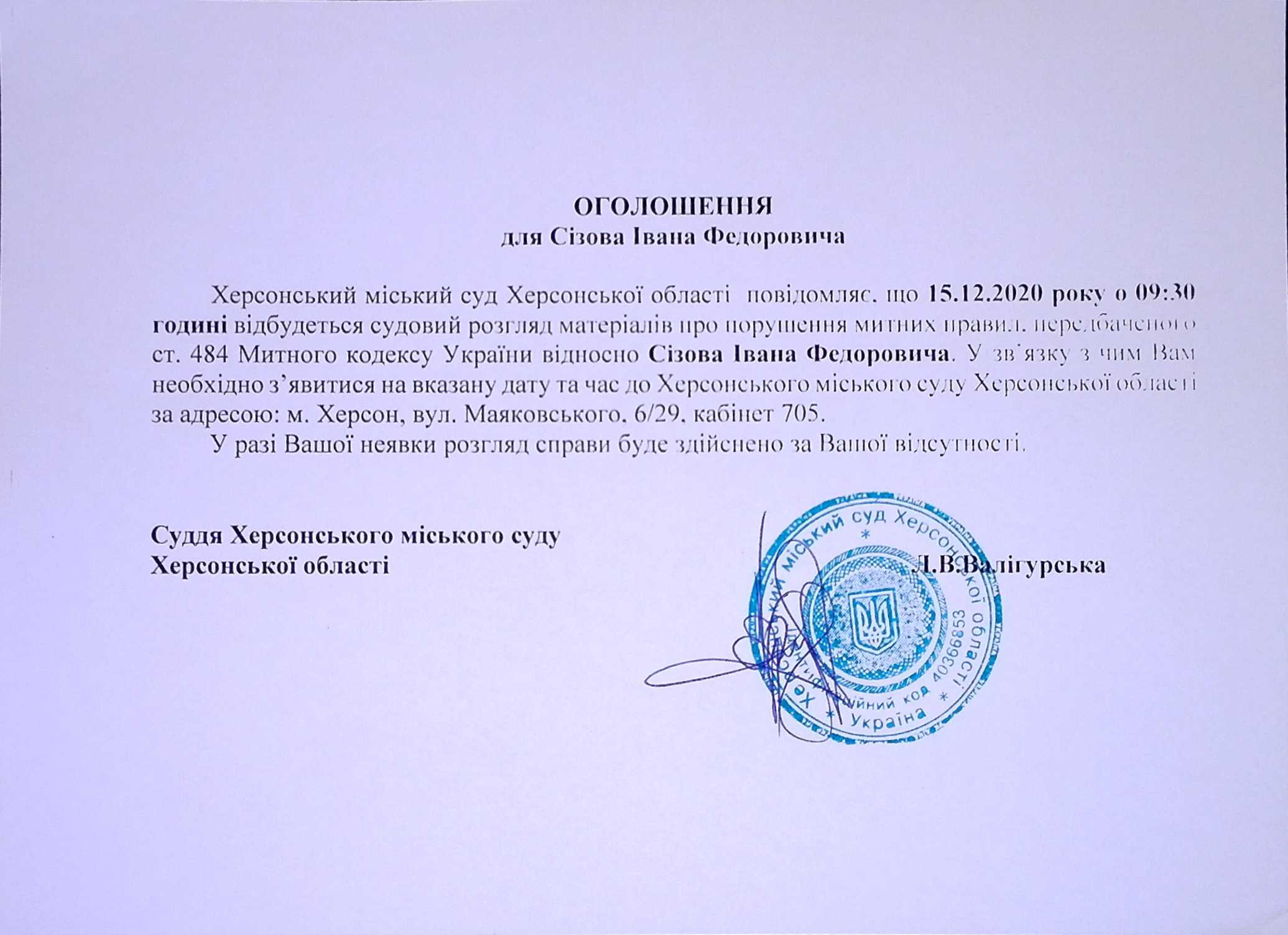 ОГОЛОШЕННЯ для Сізова Івана Федоровича