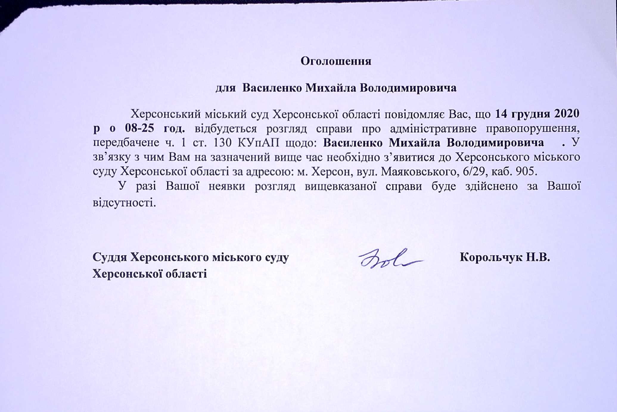 ОГОЛОШЕННЯ ПРО ВИКЛИК ДО СУДУ