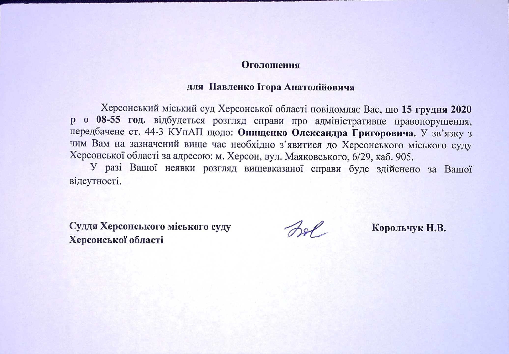 ОГОЛОШЕННЯ для Павленко Ігора Анатолійовича