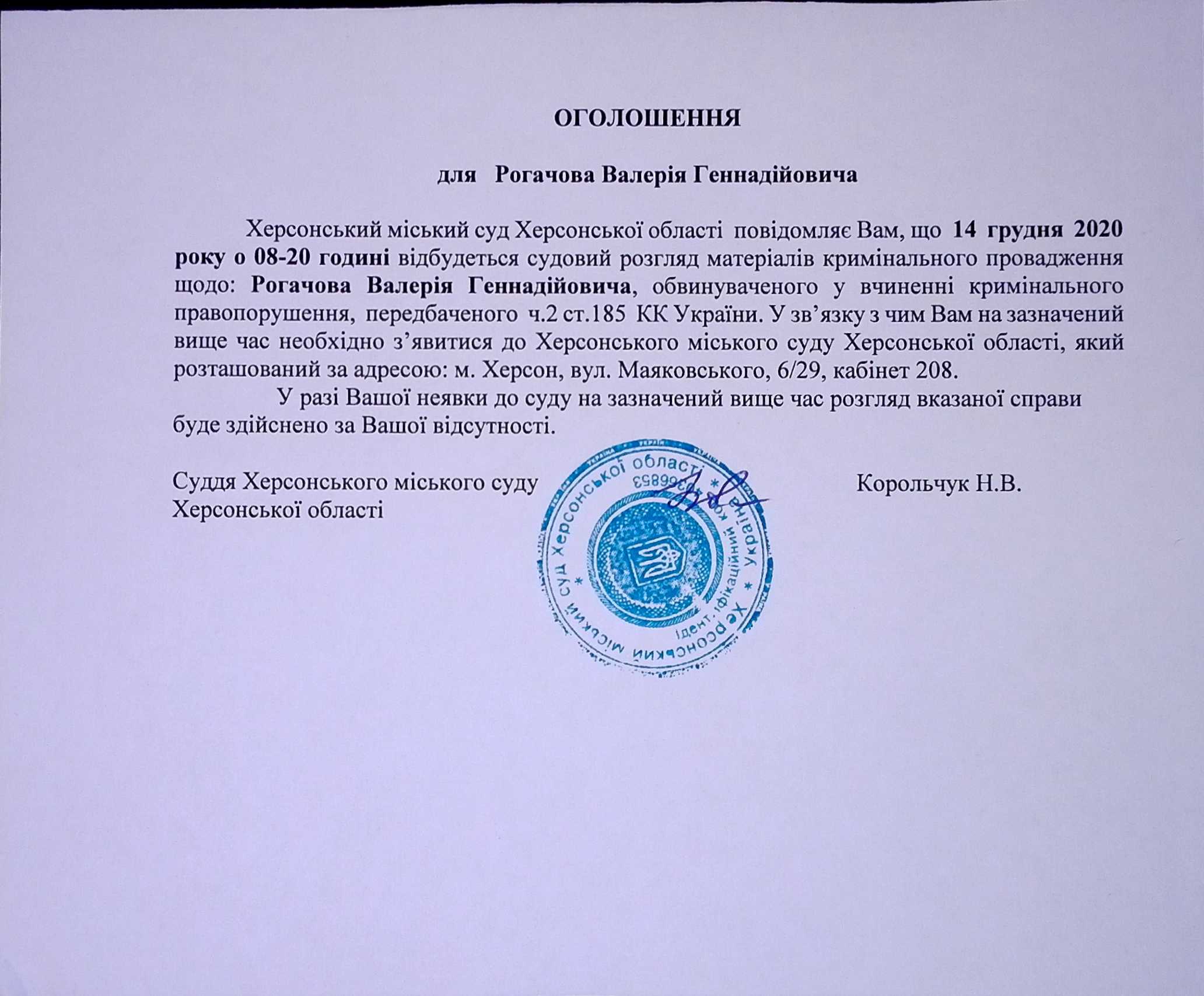 ОГОЛОШЕННЯ для Рогачова Валерія Геннадійовича