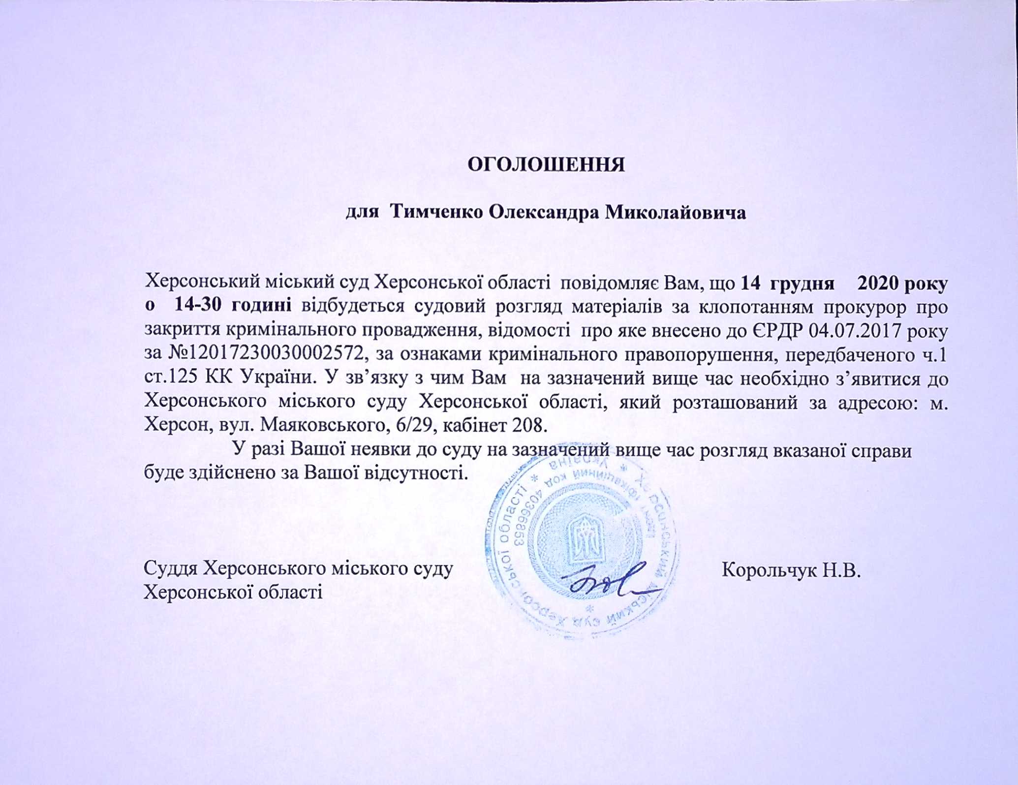 ОГОЛОШЕННЯ для Тимченко Олександра Миколайовича