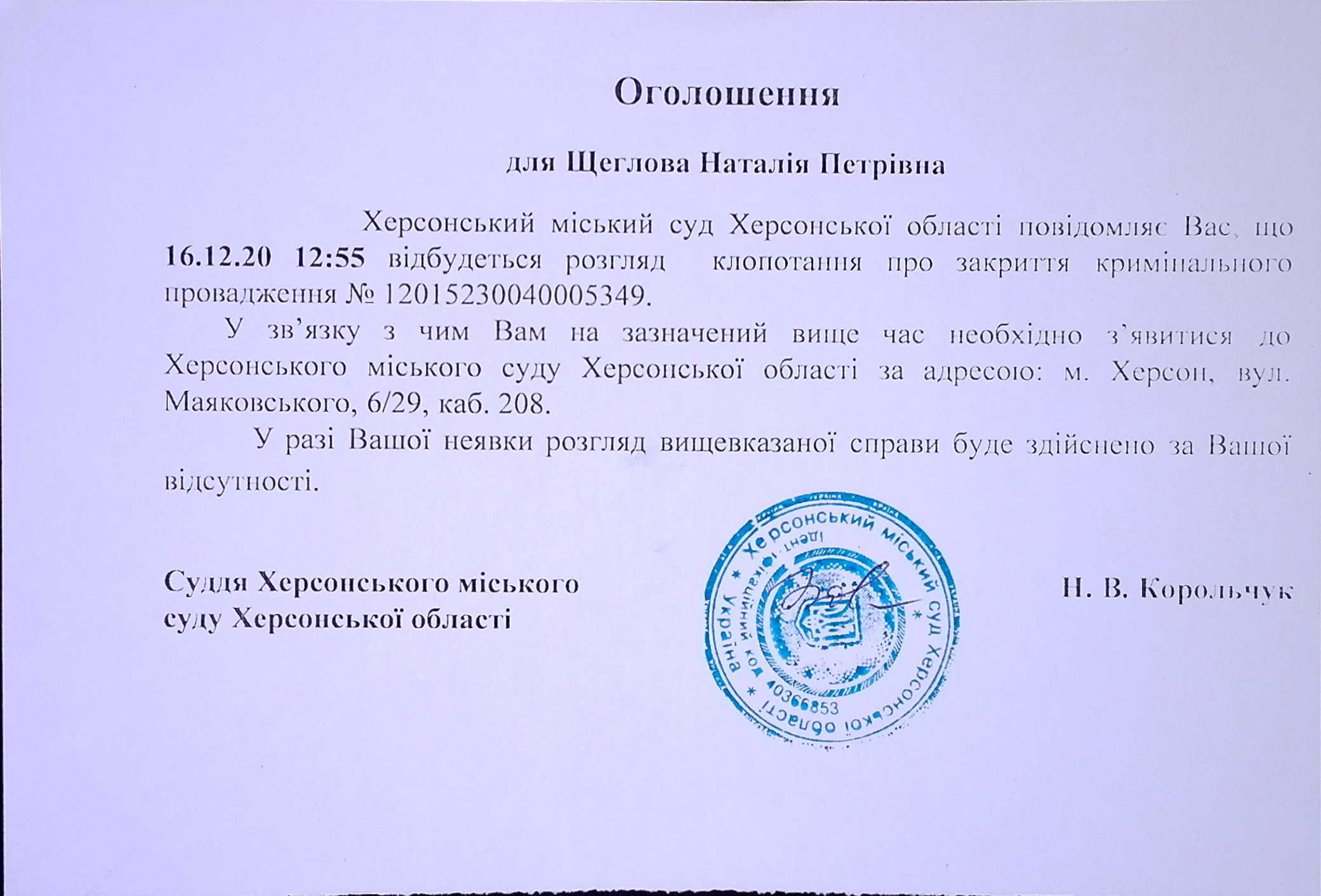 ОГОЛОШЕННЯ для Щеглової Наталії Петрівни