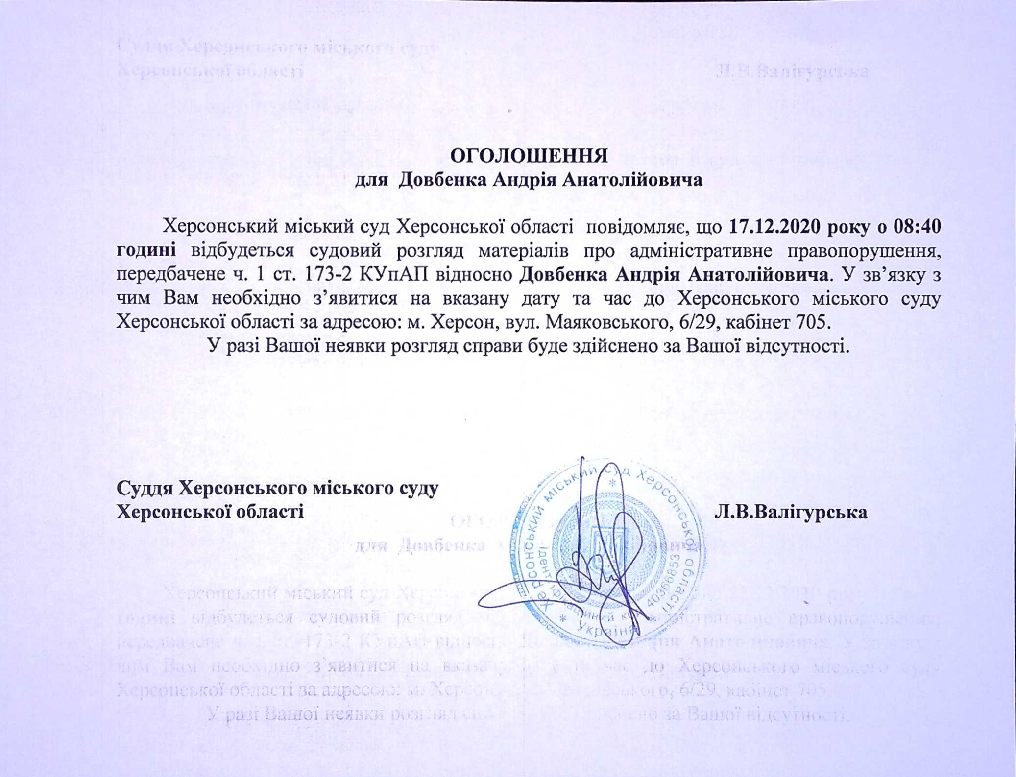 ОГОЛОШЕННЯ для Довбенка Андрія Анатолійовича