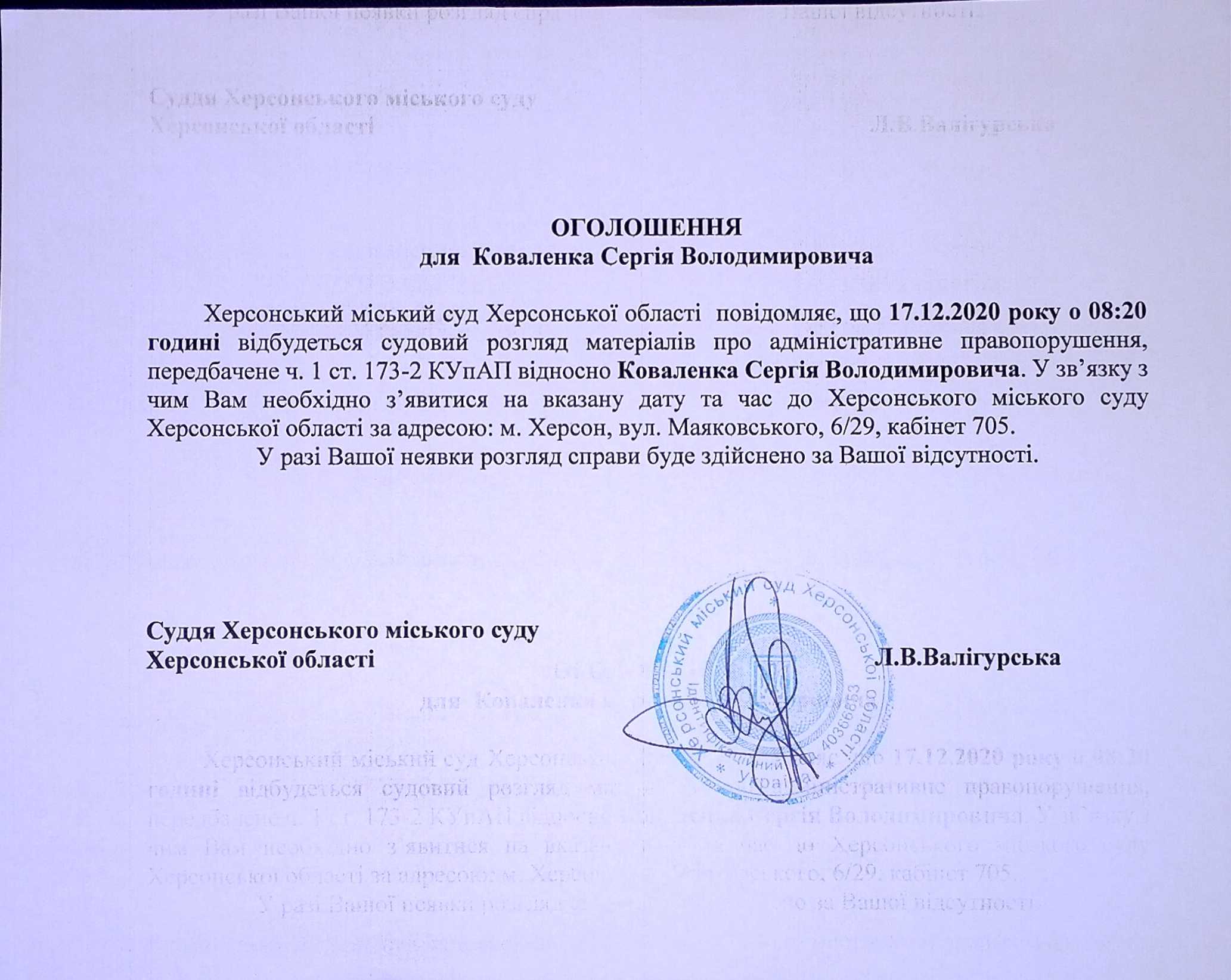 ОГОЛОШЕННЯ для Коваленка Сергія Володимировича