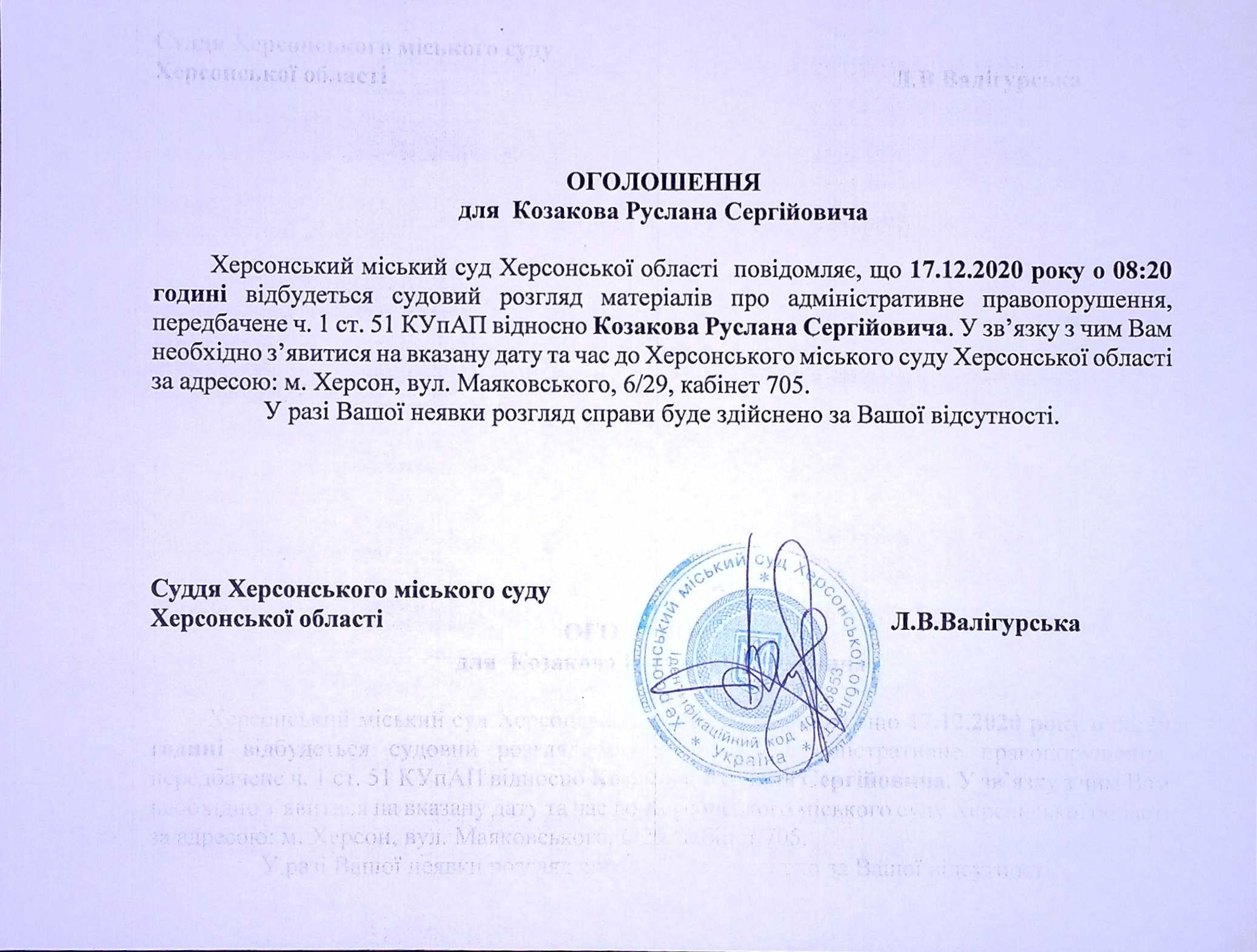 ОГОЛОШЕННЯ для Козакова Руслана Сергійовича