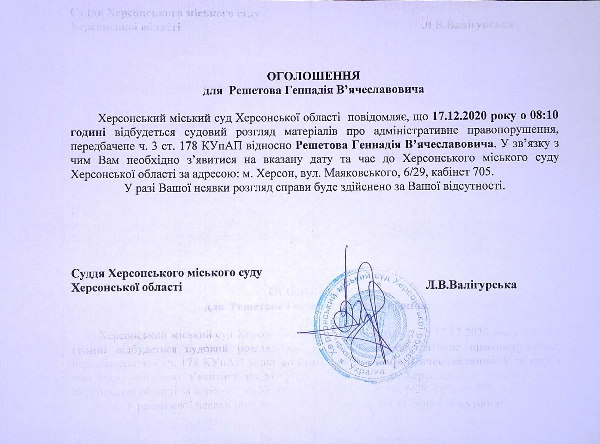 ОГОЛОШЕННЯ для Решетова Геннадія В`ячеславовича