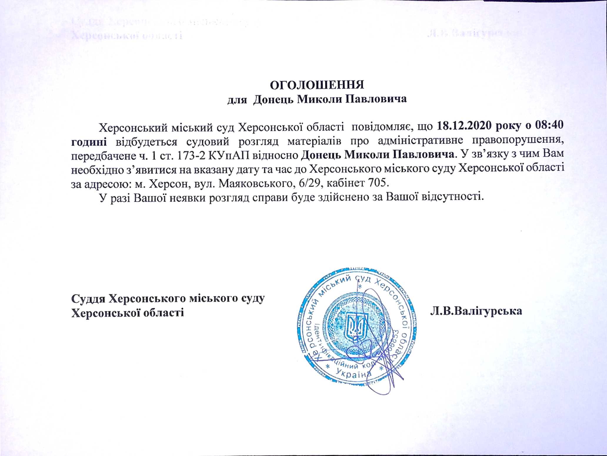 ОГОЛОШЕННЯ ПРО ВИКЛИК ДО СУДУ
